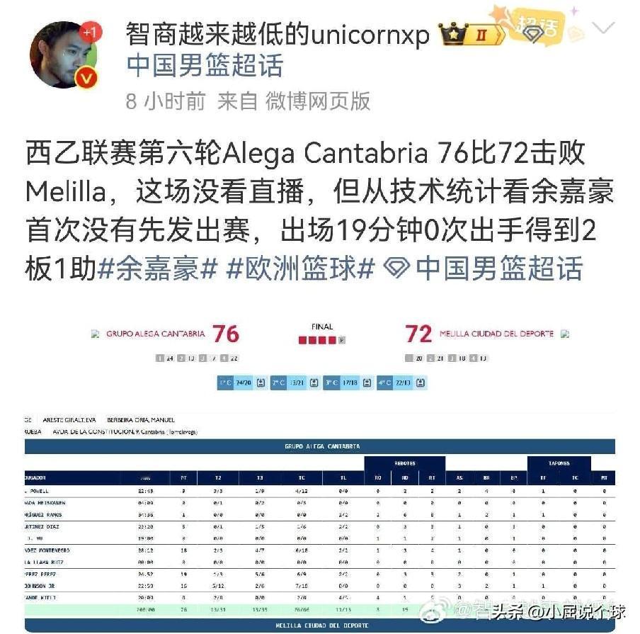 余嘉豪被用成蓝领!19分钟得0出手,六轮比赛场均4.8分3.2篮板 近日举行的西乙联赛第六轮比赛中,余嘉豪帮助球队以76-72战胜对手,不过余嘉豪在连续五场首发的情况下,这一场替补出场19分钟,然而没有得到一次出手机会,全场数据为0分2篮板1助攻,不过他的正负值+9全队最高。 余嘉豪在西乙联赛打了六场比赛了,场均出场18分钟,场均只能得到4.8分3.2篮板1.2助攻,虽然得分不多,这也是因为他的出手机会太少了,多次全场0出手,然而他多场比赛正负值全队第一,可以看出他对防守作用还是很明显的,彻底被用成一个篮球中锋了。