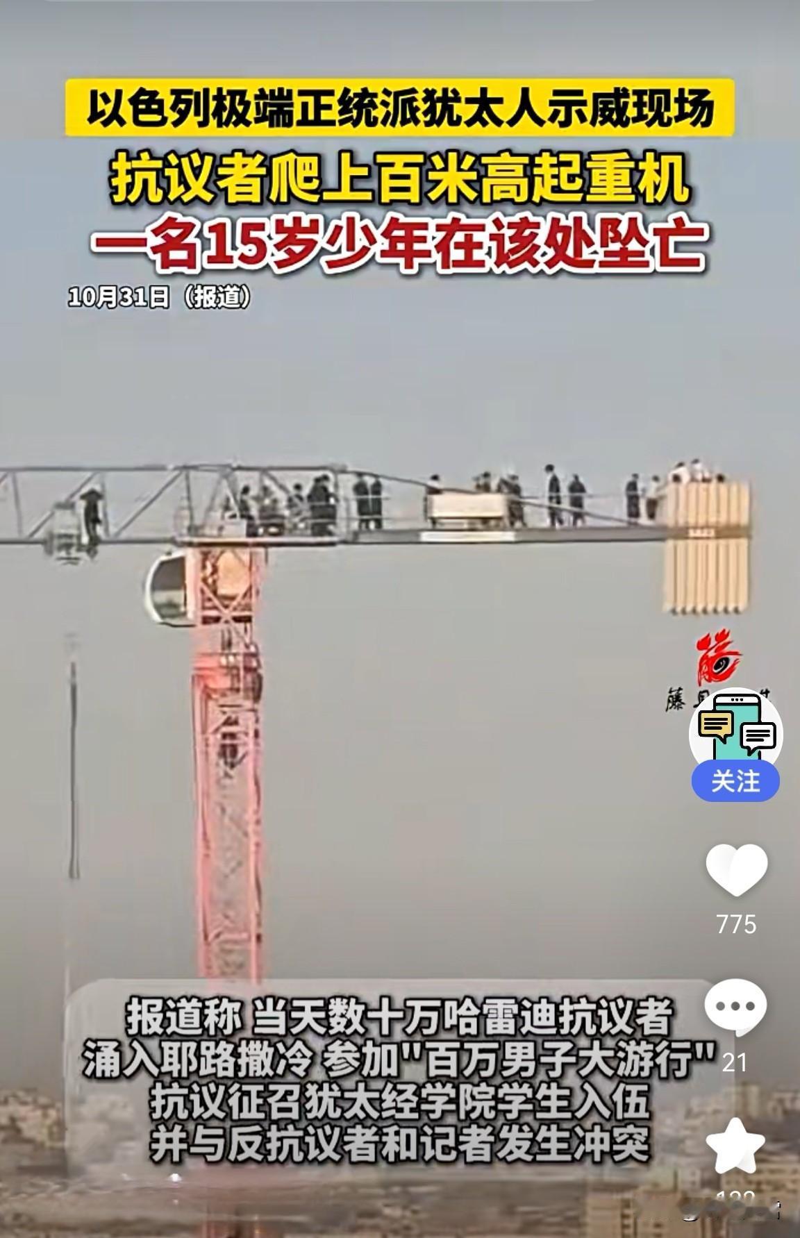 早上刷到一条揪心的视频:以色列,一个15岁的少年,从百米高的吊塔上摔下了。他不是在玩极限运动,而是在抗议政府要征他去当兵。 这孩子是以色列的“哈雷迪”,极端正统派犹太人,还不是普通人家的。在以色列,这群人地位特殊,因为他们人数少,而且以色列人觉得,他们研究经文是在“守护犹太人的精神”。过去几十年,政府都免了他们的兵役。 但现在,情况变了。以色列跟哈勒斯坦那边打了这么久,军队扛不住了。政府没办法,只能把主意打到这群“特殊的人”头上。 去年开始征兵,结果7000多人跑了,900多人被抓。今年更狠,政府一口气甩出54000张入伍通知,专挑年轻学生下手。这不,前几天,几十万哈雷迪上街抗议。那个15岁的少年,就是爬到塔吊上抗议,结果失足摔死的。 看完视频,我不楚想起抗日战争期间,日本也是这样,兵不够了,就拿娃来凑。不管是该读书的年纪,还是有啥特殊身份,战争机器开动起来,碾碎的都是活生生的人命。“少年兵”这个词,沾满了多少血泪? 内塔尼亚胡顶着压力要征少年兵,说白了,仗打到这份上,以色列是真没人了。前线士兵死伤惨重,后方老百姓负担也重得要命。普通以色列人看哈雷迪不用当兵不用干活,早就一肚子火。 但你说内塔尼亚胡全是为国为民?我看未必。他现在这个位置也悬得很。战争要是真停了,他很可能就得下台,甚至被清算。只有仗继续打,他才能靠着“战时状态”保住权位。 想想那个15岁的孩子,他本该捧着经书,或者和同龄人一样懵懂成长。现在呢?冰冷的泥土下面,一切都结束了。战争这台绞肉机,吃人的时候,哪管你是巴勒斯坦人还是以色列人,是普通百姓还是“特殊群体”?更不管你是不是才15岁。 内塔尼亚胡和他的同僚们在盘算权位得失的时候,又有多少少年、青年的命,像这个孩子一样,无声无息地消逝了?我们总说孩子是未来,可战争,却在无情地吞噬未来。 视频转图文大赛 以色列出大事情 以色列出事 中东狠人以色列