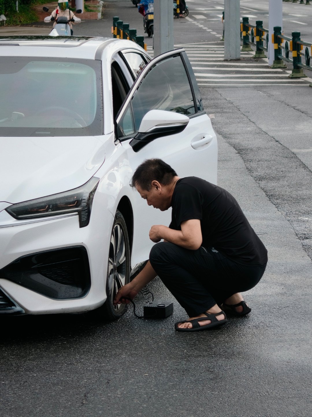 下来充气,半天没反应,他说估计扎了个大钉子。