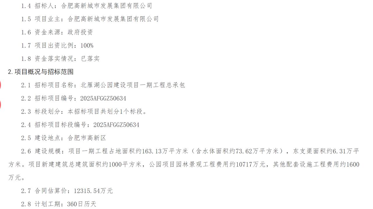 合肥北雁湖公园建设项目一期工程总承包招标公告(评定分离)。这个公园不小,项目一期工程占地面积约163.13万平方米(含水体面积约73.62万平方米),东支渠面积约6.31万平方米。项目新建建筑总建筑面积约1000平方米。