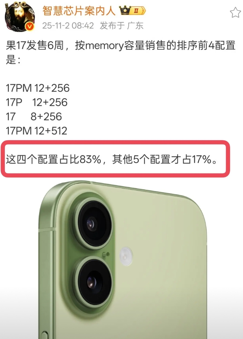 你看这个数据,iPhone17 Pro Max(256G,512G)、17 Pro(256G)、17(256G)三款手机四个配置,销量占比高达83%,如果说其中256G的占比,郝评认为超过了70%,也就是说10个买iPhone17系列的人,至少7个都选了256G。
