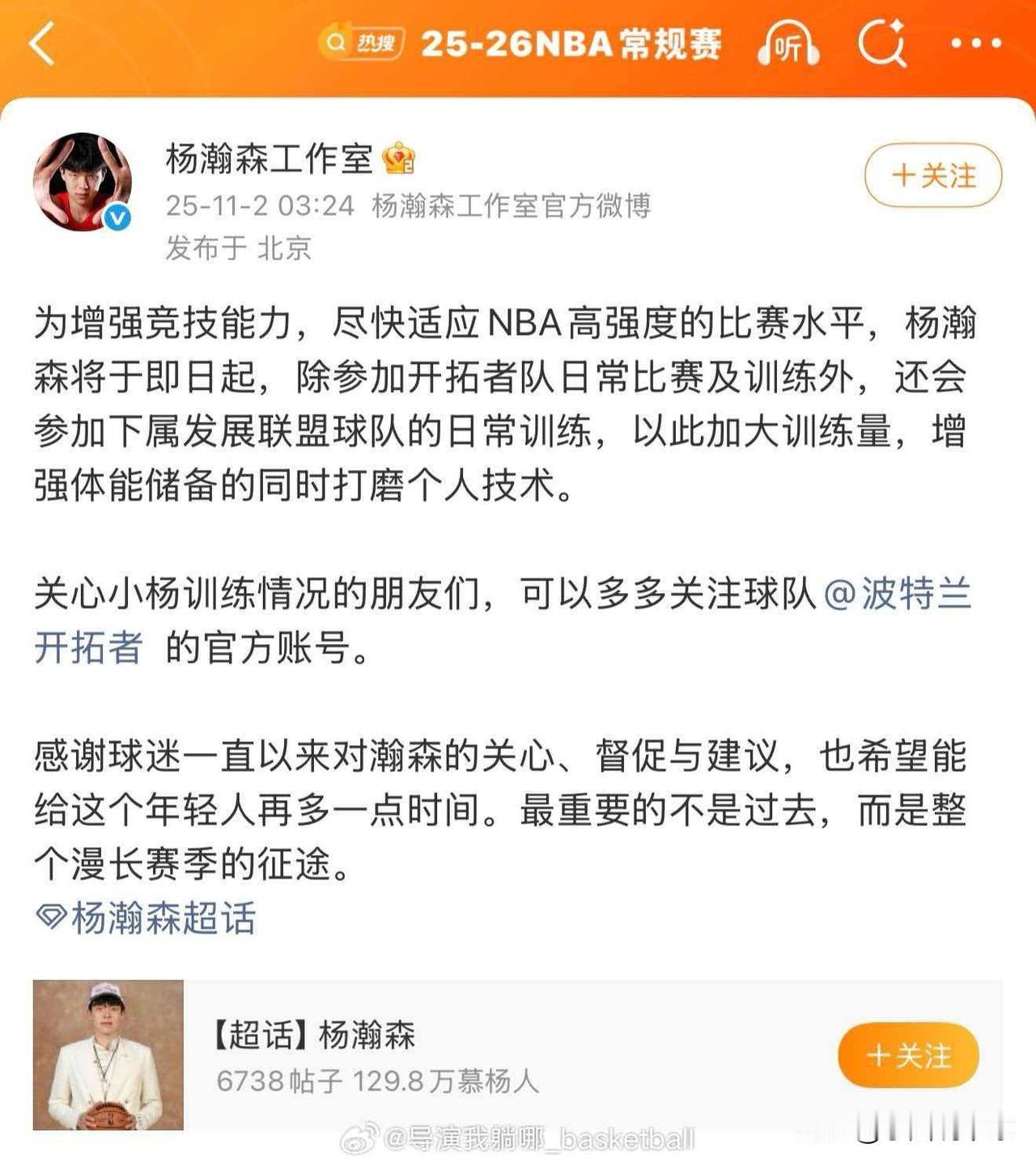 杨瀚森工作室回应被下放到发展联盟 杨瀚森被开拓者下放到发展联盟锻炼,一石激起千层浪,国内媒体和球迷纷纷吐槽杨瀚森自己不努力,没有上进心,精力全部用在女朋友身上,更多很多网友直接在杨瀚森女朋友社媒评论出言侮辱,骂的小姑娘直接清空了社媒的视频和作品。 然而杨瀚森工作室也做出了回应,他们表达的意思是,为了增强竞技能力,尽快适应NBA强度,即日起杨瀚森除了参加开拓者的日常比赛和训练外,还会参加开拓者发展联盟球队的训练,以此增加训练量、加强体能储备的同时磨练个人技术。 也可以说并不是下放,因为杨瀚森还是开拓者球队一员,他是在参加开拓者的日常比赛和训练外,增加去发展联盟球队的训练,并没有说打发展联盟的比赛,而且开拓者球队有比赛的时候他还是会回归球队的,所以说这次仅仅是给杨瀚森增加训练量,并不是所谓的下放,当然了杨瀚森要努力快速适应NBA强度,不然下放甚至被交易都是有可能的事。