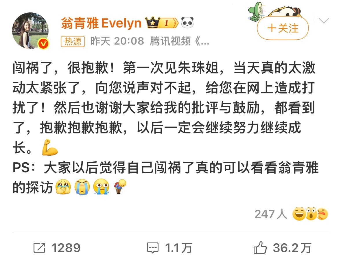 翁青雅道歉翁青雅向朱珠道歉 翁青雅就采访朱珠引发的争议发微博道歉,朱珠评论区回复:早翻了[并不简单]