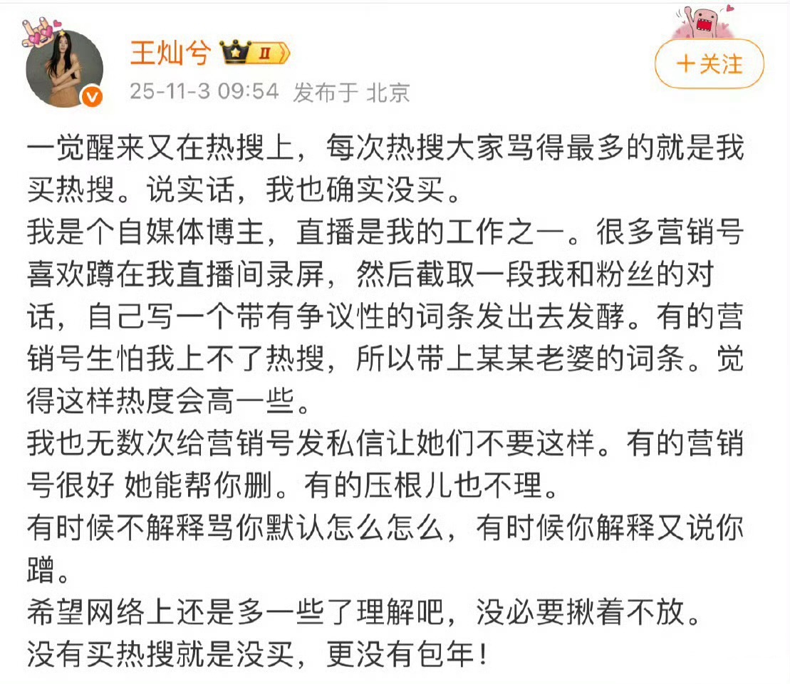 杜淳妻子王灿发微博说没买热搜,也没包年![允悲][允悲][允悲]杜淳妻子回应被指