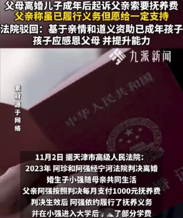 天津,阿珍和阿强离婚时,儿子小强被判随阿珍生活,阿强每月付1000元抚养费,还要承担小强部分大学的学费,可小强成年后,阿强觉得法定抚养义务已经完成,便停付了抚养费,小强起诉父亲要抚养费,最终这样判! (来源:九派新闻、天津高院) 阿强和阿珍离婚,判得明明白白,儿子小强归阿珍抚养,阿强每个月得掏1000块抚养费,这钱阿强从来没拖欠过,每个月都按时打到阿珍卡上。 小强上大学后,阿强觉得孩子大了,花钱的地方更多,除了每月的抚养费,还主动承担了小强一部分学费,阿强心里想着,孩子能读好书,将来有出息,自己这点付出也值。 阿强是个实在人,虽然和阿珍离了婚,但对小强的关心一点没少。每次小强放假,阿强都会提前买好孩子爱吃的菜。阿强觉得,自己和阿珍没了感情,但孩子永远是自己的骨肉。 小强就到了十八岁,阿强觉得,按照法律规定,孩子成年了,自己的抚养义务也就到头了。 从那以后,阿强就没再给过小强抚养费,不过偶尔孩子缺钱,阿强还是会给点零花钱。 阿强觉得孩子成年了,就该学会独立,不能总靠父母,自己年轻时,十八岁就出来赚钱了,现在条件好了,孩子也不能太娇惯。 小强,刚开始也没觉得有啥不对。他觉得父亲已经养了自己这么多年,现在自己成年了,确实不该再向父亲要钱了。 可大学里的开销实在不小,除了学费,还有生活费、买书的钱,每个月下来也要不少的钱。 小强试着去赚钱,可大学课程紧,他只能利用周末和假期去兼职,赚的钱能补贴点生活费,但还是不够。 阿珍觉得孩子还在读书,没有经济来源,阿强作为父亲,还是应该继续给抚养费,阿珍试着和阿强沟通,阿强说自己已经完成了法定抚养义务,不会再给了。 阿珍没办法,只能劝小强再和父亲说下,小强犹豫了很久,最后还是决定起诉父亲,要继续要抚养费。 小强不想和父亲闹僵,可现实又让他不得不这么做。 2024年年底,小强起诉了父亲。 小强的诉求是:自己还在读书,没有经济来源,希望父亲能继续给抚养费。 阿强不怎么想,孩子成年了,自己没有法定抚养义务了。不过看孩子读书没收入,自己有能力还是会帮,但这和法律上的抚养义务是两码事。 这种情况下,小强是否有必胜的起诉理由,要求阿强继续支付抚养费? 驳回小强的诉求,依据的是《民法典》第一千零六十七条,这条规定,父母不履行抚养义务时,未成年子女或者不能独立生活的成年子女,有要求父母给付抚养费的权利。 不能独立生活的成年子女,据司法解释,是指尚在校接受高中及其以下学历教育,或者丧失、部分丧失劳动能力等非因主观原因而无法维持正常生活的成年子女。 本案中,小强已经成年且在大学读书,大学教育不属于高中及其以下学历教育,小强也不存在因残疾或重大疾病等丧失劳动能力的情况。 所以,他属于能够独立生活的成年子女。 阿强作为父亲,在小强成年后,从法律层面讲,确实没有法定抚养义务了,驳回诉求是合理合法的。 要是小强能证明自己确实因客观原因无法独立生活,比如因残疾或重大疾病等丧失劳动能力,阿强是否仍需承担抚养义务呢? 因为根据上述提到的法律条款,这种情况下小强就属于不能独立生活的成年子女,阿强作为父母,就必须履行抚养义务,小强起诉要求阿强继续支付抚养费,就有必胜的理由。 毕竟父母对子女的抚养义务,是基于血缘关系产生的法定责任,不会因为子女成年就完全消失,当子女确实无法独立生活时,父母就得继续提供经济支持。 法院审理认为,小强已经成年,而且在大学读书,不属于不能独立生活的子女。阿强作为父亲,在小强成年后,确实没有法定抚养义务了。 最后,驳回了小强的诉求。还劝小强,要感恩父母的付出,提升自己的能力,靠自己的努力完成学业。