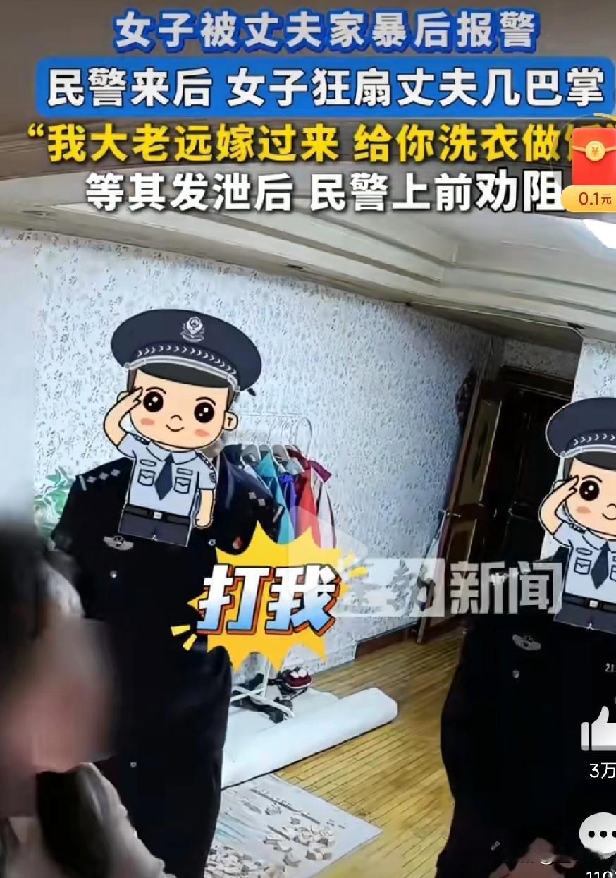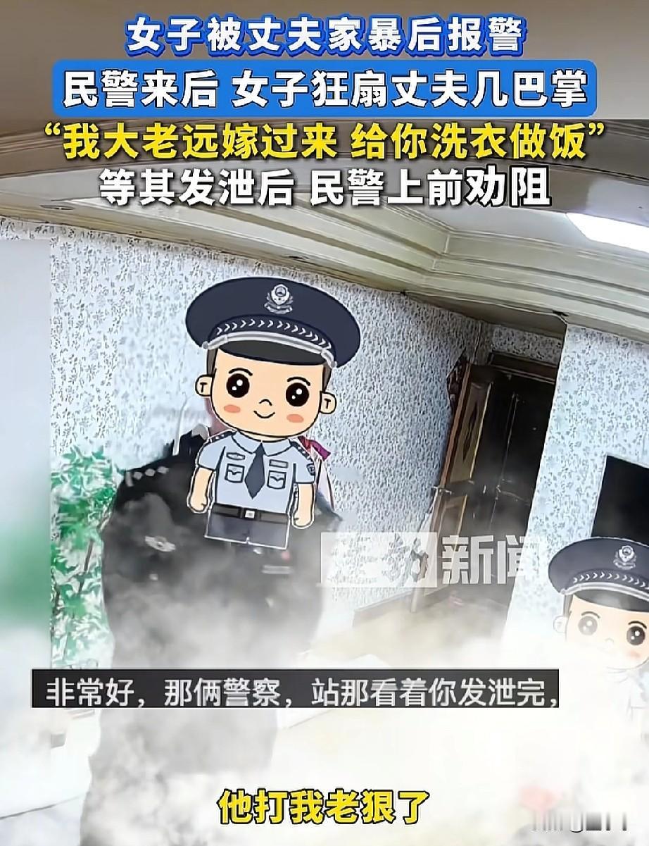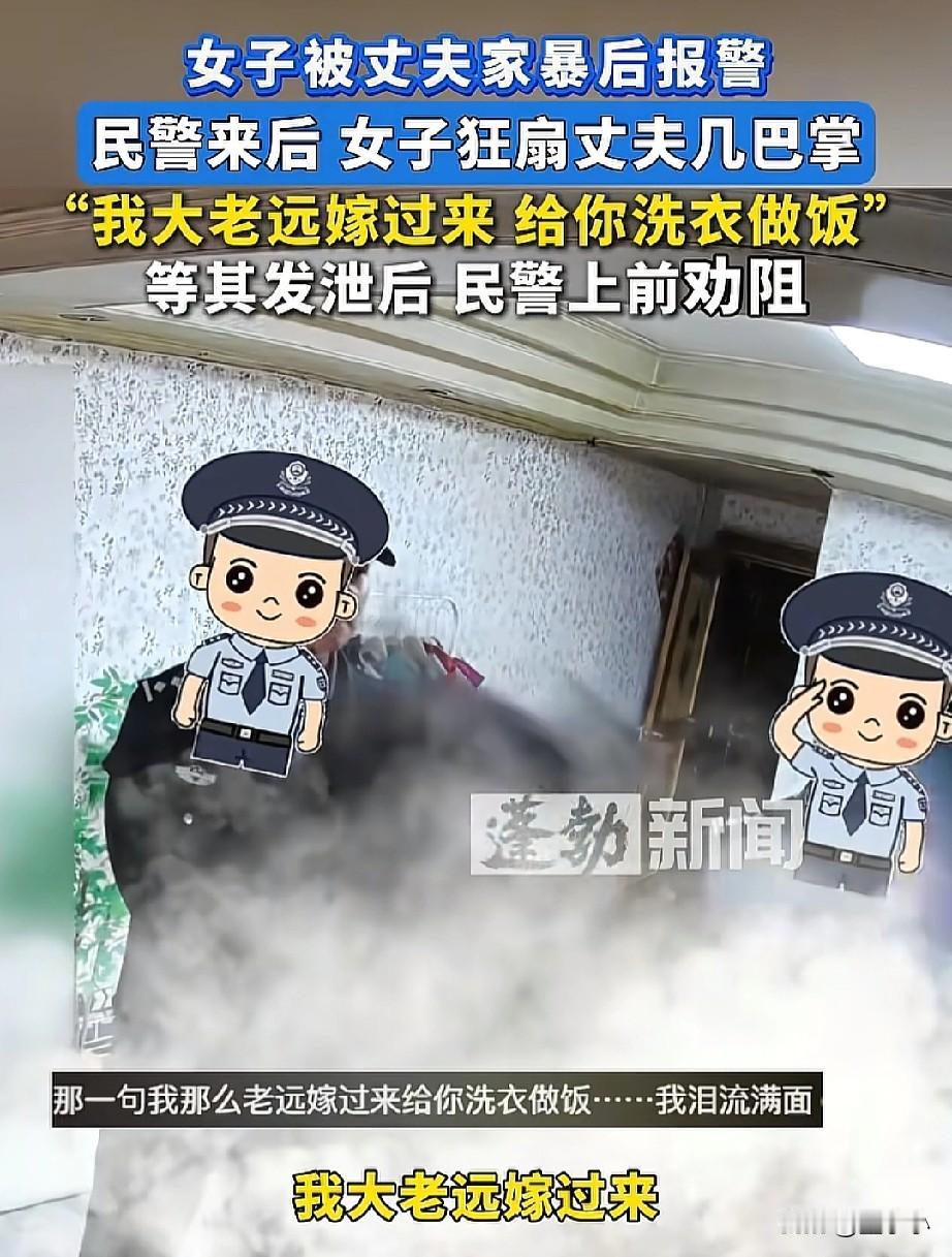 人性化执法!辽宁,一女子被打后报警,民警来到后,女子就开始狂删丈夫,还怒怼丈夫,我大老远的嫁过来,给你洗衣做饭,就让你打我的,等女子发泄完后,民警这才上前劝阻。网友: 给这样通情达理的民警点赞! 事发当天,女子想要带孩子去午睡,而丈夫却不让,两人发生了争执,丈夫将妻子摔倒在地并且实施暴力。 在明知打不过的情况下,女子报警了,民警火速来到现场后,女子情绪特别的激动,直接怒扇丈夫耳光,还大声的指责丈夫,我大老远的嫁过来,给你洗衣做饭。 这一过程,丈夫是全程没有还手,任由妻子对她拳打脚踢,等女子发泄完后,两位民警这才上前劝阻。 从女子的指责中可以了解到,女子是远嫁到这里的,这么多年尽心尽力的操持家务,洗衣做饭带孩子,没想到却被打,这一刻她心里应该是既委屈又后悔了吧。 此事引发网友的热议! 有的网友表示,作为一位女人真的很心酸,尤其,是听到她大老远嫁过来,家暴有一次就有无数次,坚决抵制家暴。 很不解这样的男人,男人的拳手是打江山的,而不是打自己老婆的,尤其还是当初是自己千辛万苦寻来的老婆,怎么能忍心下的去手。 如果有暴力倾向的男人,还是不建议他们结婚,自己过反而更好。