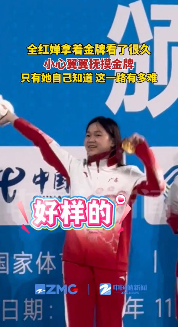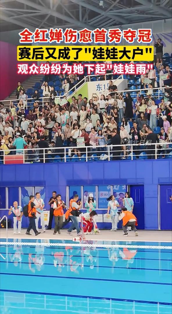 183天后,全红婵又成娃娃大户,出战团体女双10米跳台,搭档王伟莹,助广东队夺得跳水女子团体冠军。 11月2日晚,进行的跳水团体女双10米跳台的比赛,全红婵/王伟莹总分235.86排名第一。上海组合陈芋汐/掌敏洁落后0.9分获得第二。 赛后,现场娃娃纷纷落下,犹如一场娃娃雨,全红婵欢快的一个一个的捡起来,挥手致谢,抱的满满的。还高兴的在社媒发文称赞自己:“我真棒”。 虽然已经是一个大学生了,还是那么的喜爱娃娃!