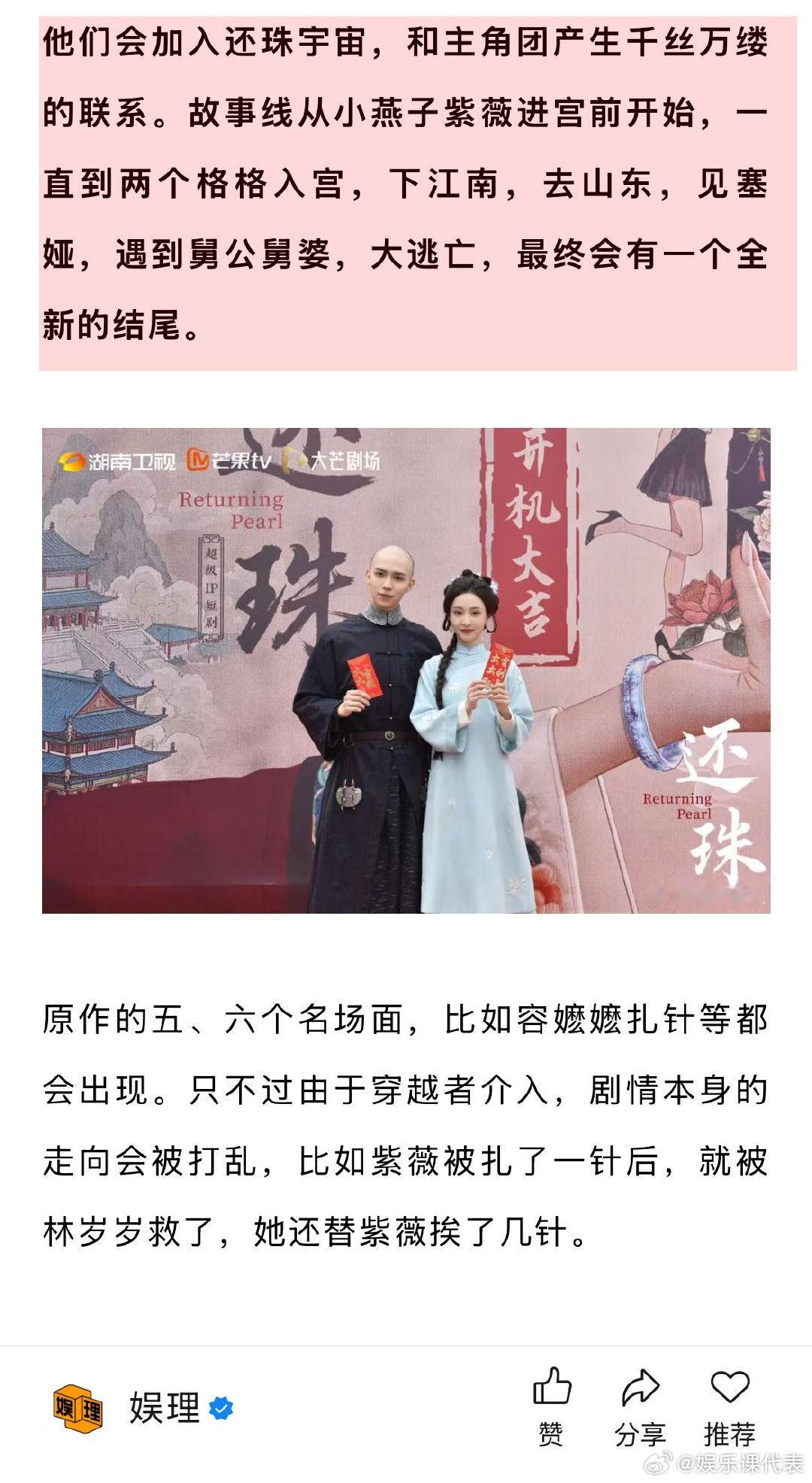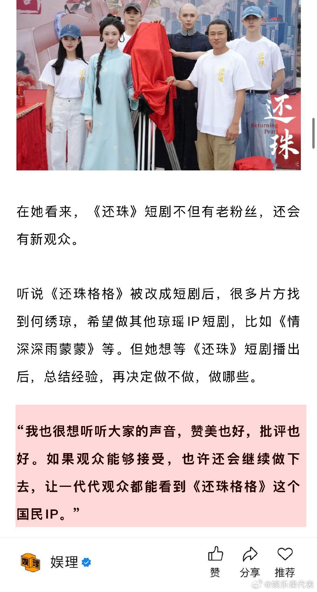 导演谈短剧还珠选角罗一舟胡连馨 短剧还珠有罗一舟的荧屏初吻 听说《还珠格格》被改成短剧后,很多片方找到何绣琼,希望做其他琼瑶IP短剧。但她想等《还珠》短剧播出后,总结经验后再决定做不做,做哪些。“我也很想听听大家的声音,赞美也好,批评也好。如果观众能够接受,也许还会继续做下去,让一代代观众都能看到《还珠格格》这个国民IP。”娱理独家↓