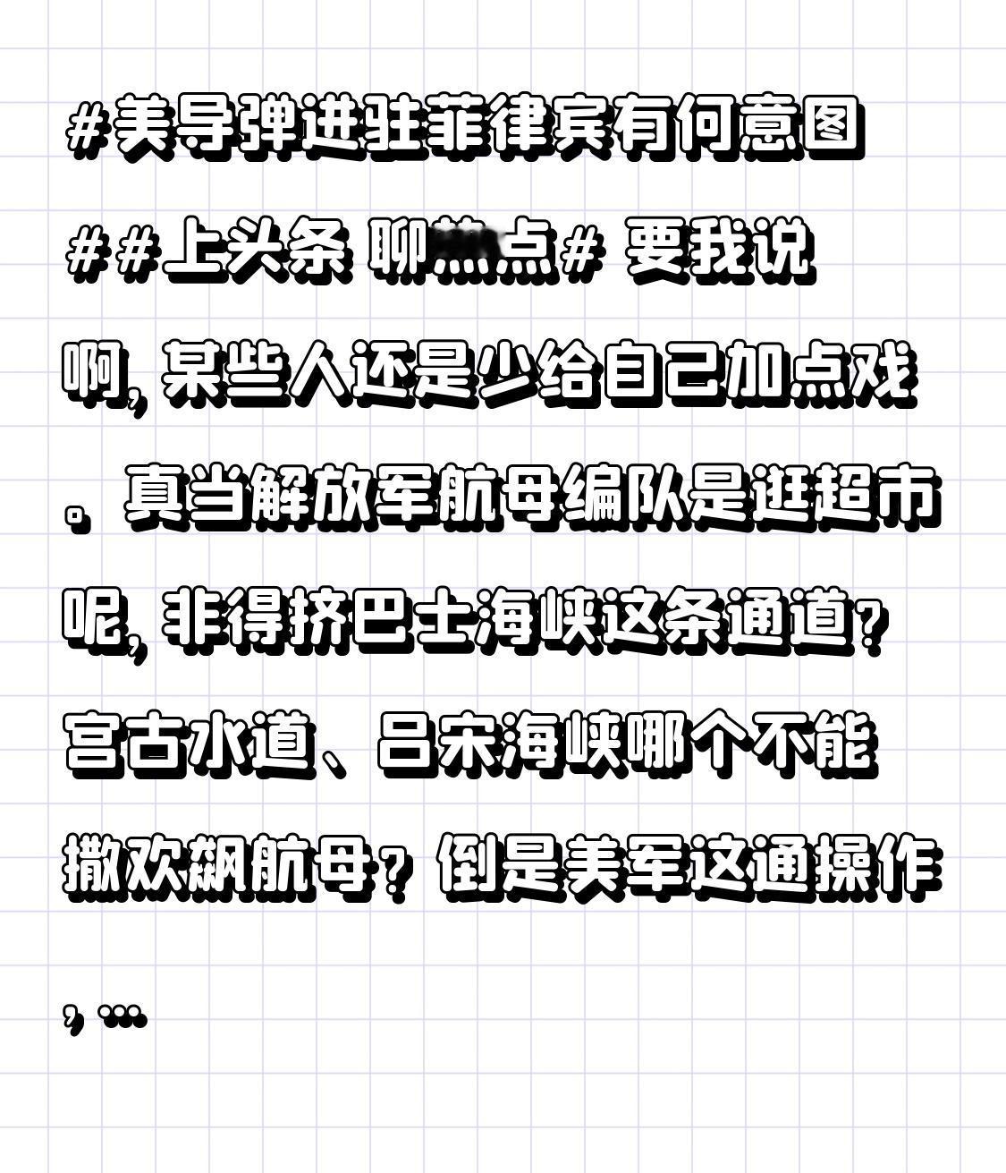 要我说啊,某些人还是少给自己加点戏。真当解放军航母编队是逛超市呢,非得挤巴士海峡这条通道?宫古水道、吕宋海峡哪个不能撒欢飙航母?倒是美军这通操作,分明是举着喇叭喊:“菲律宾快看!我为你得罪中国啦!”等哪天导弹车真成了活靶子,您猜第一个申请紧急撤侨的会是谁?