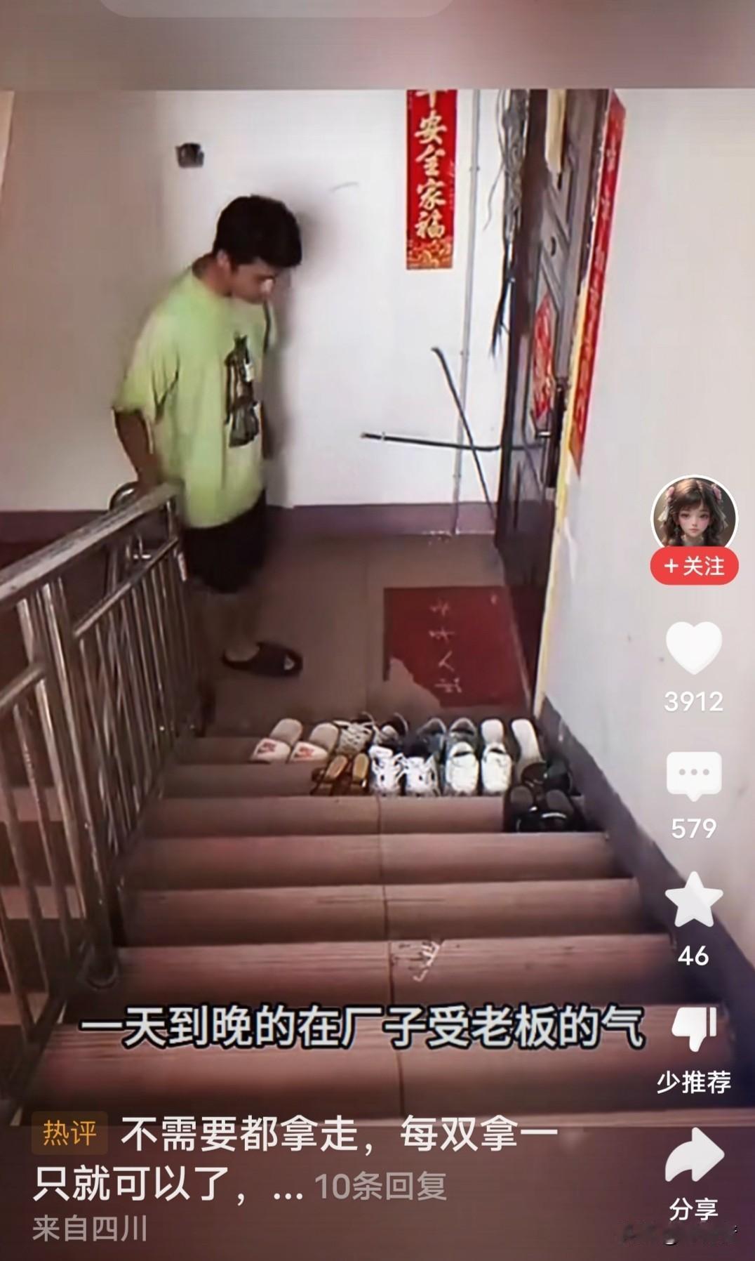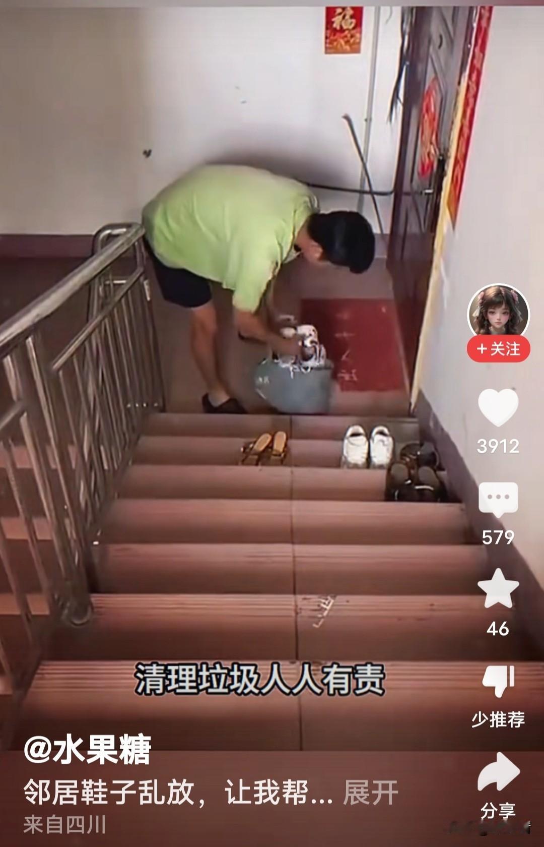 楼道里摆满臭烘烘的鞋子。路过小伙子心里特不爽,他直接打包准备扔外边垃圾桶。这办法合适吗? 住户太不讲究了,只顾自己方便,楼道里放好几双鞋子。远远看去就给人不舒服的感觉。楼上小伙子没有惯这坏毛病,直接弯腰收拾包里,准备扔楼下垃圾桶。 有网友说,“这招太灵了。还帮助他人收拾垃圾是中华民族的传统美德。” “这样干得漂亮,有些人就要硬碰硬!你软弱别人以为你好欺负呢。” “这太不地道了,你好歹每双鞋子给人留一只啊。” “所以,有钱一定要住好一点的小区,里边人素质会高一点,这种事情会减少发生。” 你说,遇到这种人楼道放鞋子,该怎么办?