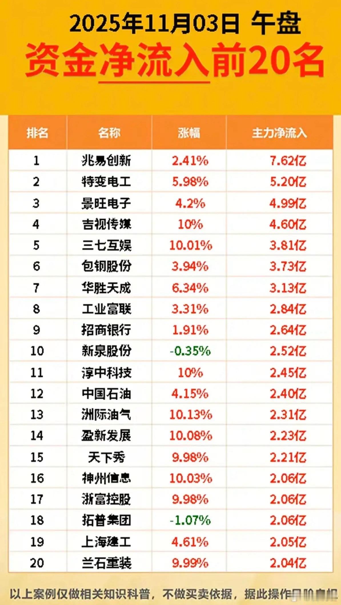 2025年11月3日午盘,A股资金净流入前20股覆盖科技、传媒、能源、金融、制造业等多板块,多股涨停(如吉视传媒、三七互娱等),显示市场热点多元。资金一方面布局科技主线(芯片、算力)的业绩确定性,另一方面炒作传媒、能源、高端装备等题材,同时部分逆跌个股(如新泉股份、拓普集团)体现资金对个股基本面的独立判断。