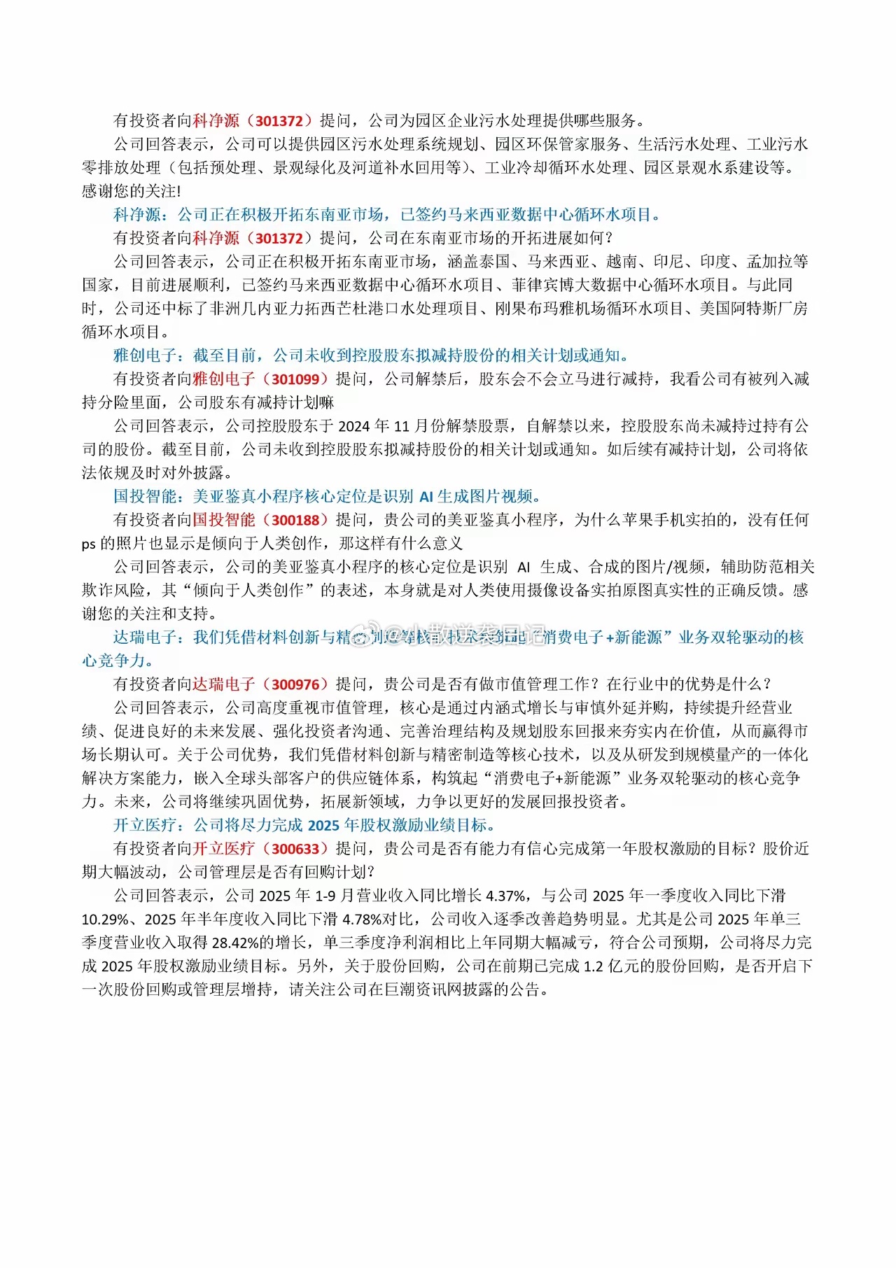 8. 开立医疗(300633):公司将全力以赴推进各项经营工作,力争完成2025年股权激励相关业绩目标。