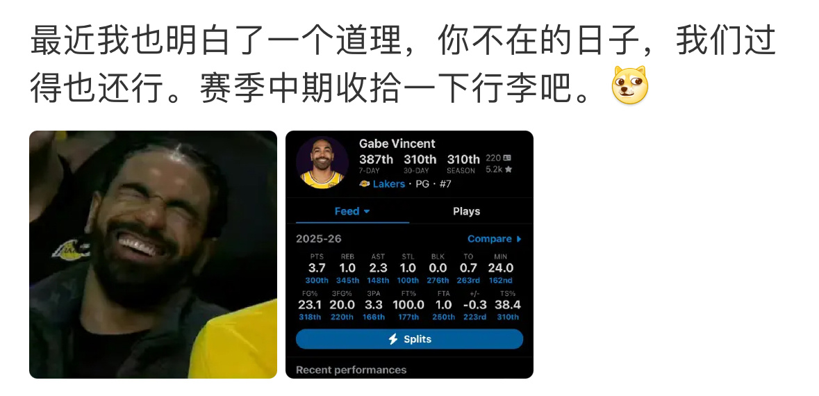 最近我也明白了一个道理,你不在的日子,我们过得也还行。赛季中期收拾一下行李吧