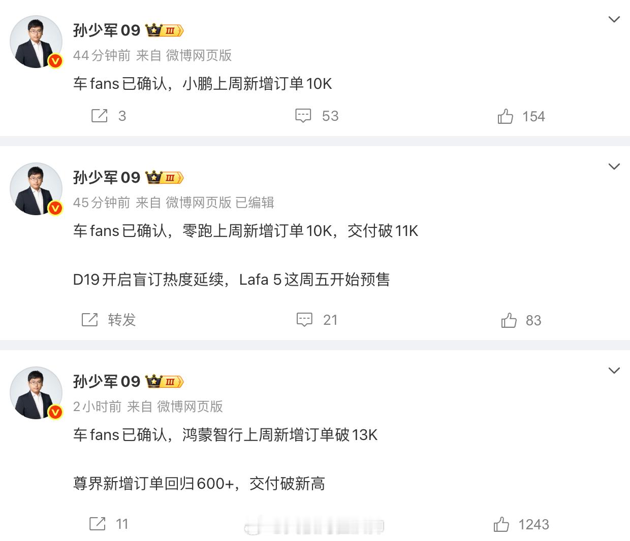 鸿蒙智行上周新增订单破13k,其中尊界新增订单 600+,交付破新高;