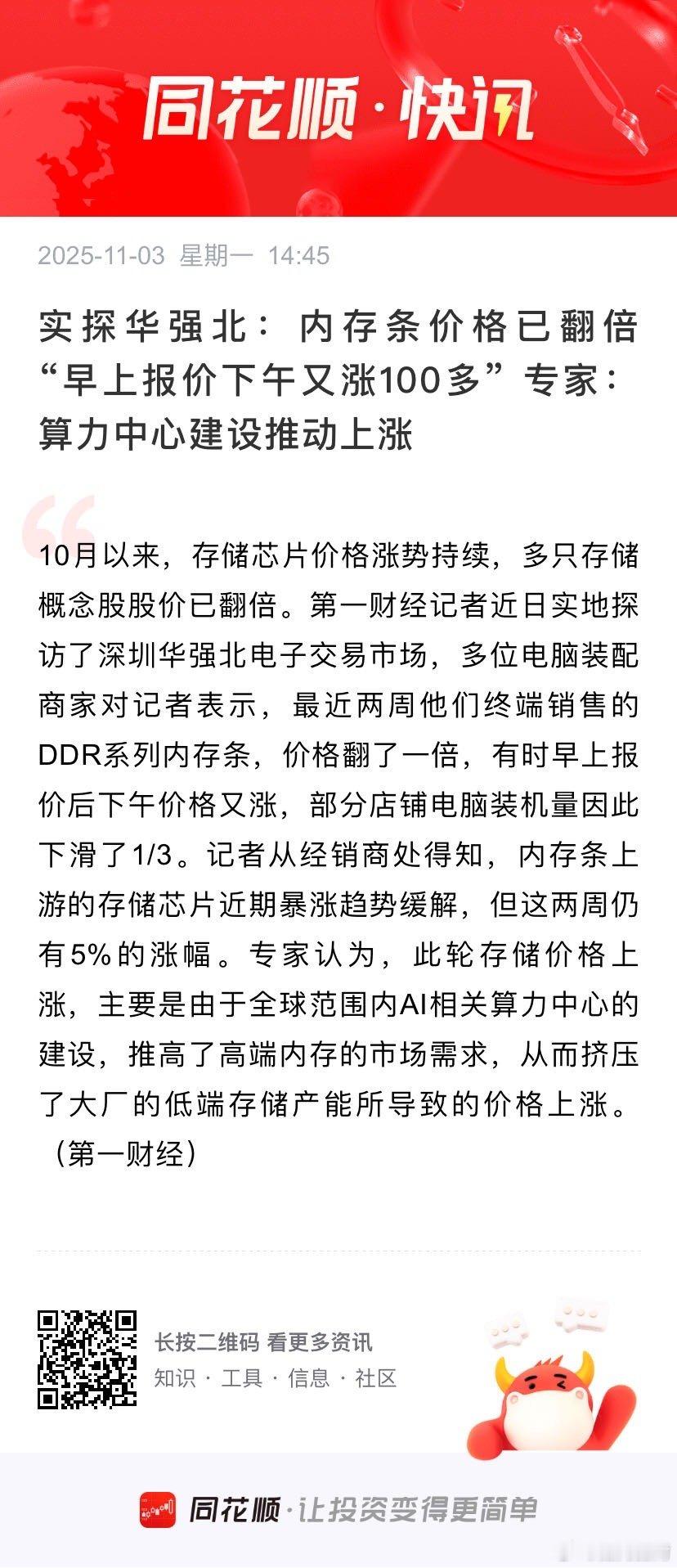 实探华强北:内存条价格已翻倍 “早上报价下午又涨100多” 专家:算力中心建设推动上涨 10月以来,存储芯片价格涨势持续,多只存储概念股股价已翻倍。第一财经记者近日实地探访了深圳华强北电子交易市场,多位电脑装配商家对记者表示,最近两周他们终端销售的DDR系列内存条,价格翻了一倍,有时早上报价后下午价格又涨,部分店铺电脑装机量因此下滑了1/3。记者从经销商处得知,内存条上游的存储芯片近期暴涨趋势缓解,但这两周仍有5%的涨幅。专家认为,此轮存储价格上涨,主要是由于全球范围内AI相关算力中心的建设,推高了高端内存的市场需求,从而挤压了大厂的低端存储产能所导致的价格上涨。(第一财经)
