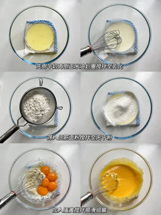 💛食材: 鸡蛋5个(带壳60克左右) 牛奶50克 玉米油50克 细砂糖50克 低筋面粉60克 柠檬汁数滴 💛烘烤温度: 上下火150度烘烤30分钟(做正卷,倒计时剩余2分钟时,提高上火温度把表皮烘烤干爽)