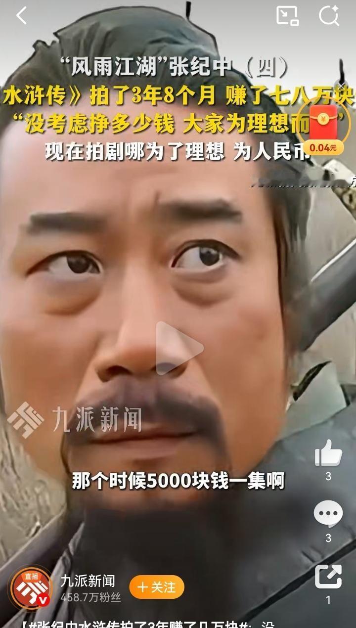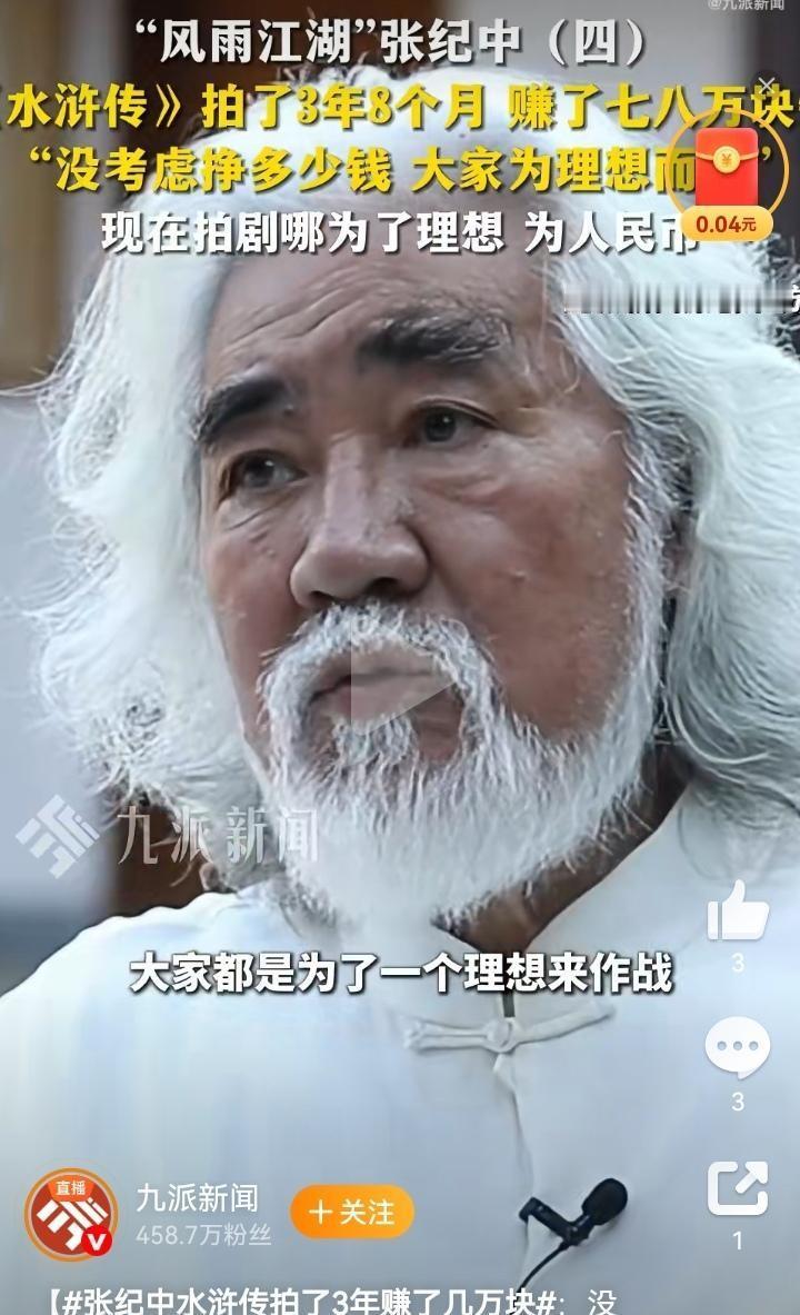 张纪中在采访时,说自己不过是一个普通导演,大家都愣住了! 那天关于《水浒传》的往事,他没藏着掖着。只说老版拍了三年八个月,总共拿了七八万。听起来,导演要养家就靠这?有点不可思议啊!但老实讲,要是跟老百姓比,这钱多得有些夸张了。九十年代的七万多,不就是现在的小型大奖嘛?! 李雪健当年演宋江,一集工资五千,放现在估计都没人信;彼时算下来,剧组里没谁能乘坐豪车进出。只他们那会儿拍戏辛苦,工资也真不算高,大腕也是普通人。再想想现在的片酬,这种变化让人头皮发麻。有人说张导谦虚了,但从圈内标准来好像也没毛病。和投资公司比,他这点算什么? 有人质疑张纪中是否“没钱”,说他买飞机买不了,其实没必要围着这个问题打转。几百亿身家太过神话,导演就算资历再老,也挤不进那些“资本大户”的圈圈。网上流传他家大业大的传基本没实际证据,数不着几个可信数据。查过中国文艺界导演收入榜,顶流也远远没有传说里的天价,况且九十年代物价不一样,钱更值钱。 张纪中的“普通导演”身份,也不是完全能让人信服。但他并没有夸张,也没像有些人一样往自己头上加戏,道谢归道谢,日子也得过。有人说这是谦虚,其实或许只是说话的方式。还有人觉得他故意淡化了家里的资产,怕舆论盯上,谁知道呢?也许人红了,别人就是喜欢吹嘘或质疑,实际过得其实挺普通。 张导说自己挣的钱只够生活费,这话听着真让人犯嘀咕。要说普通群众,三年八个月就能进账七八万,那一定能买车买房。可和圈内大佬比,他又确实算不上最高的,这标准本身就一头雾水。难道这就是娱乐圈的魔幻?还是观众的标准变得越来越古怪?问了几位业内朋友,他们的说法还不一样,有的觉得他说得对,有的说怎么可能! 数据上1996年公办单位年均工资也就6000出头。张导三年赚七八万,算下来是普通人的好几倍。但他毕竟不是普通工人,和资源多、底子厚的资本家,还是两回事。不对,这里又有点矛盾。有人觉得导演很普通,其实未必。 也许张纪中打心里觉得自己一般,也许只是想避嫌,但大家怎么这事还真没个定论。 物价、圈内、标准,忽高忽低,主角到底是个什么状况?有些东西,恐怕只能自己想去。