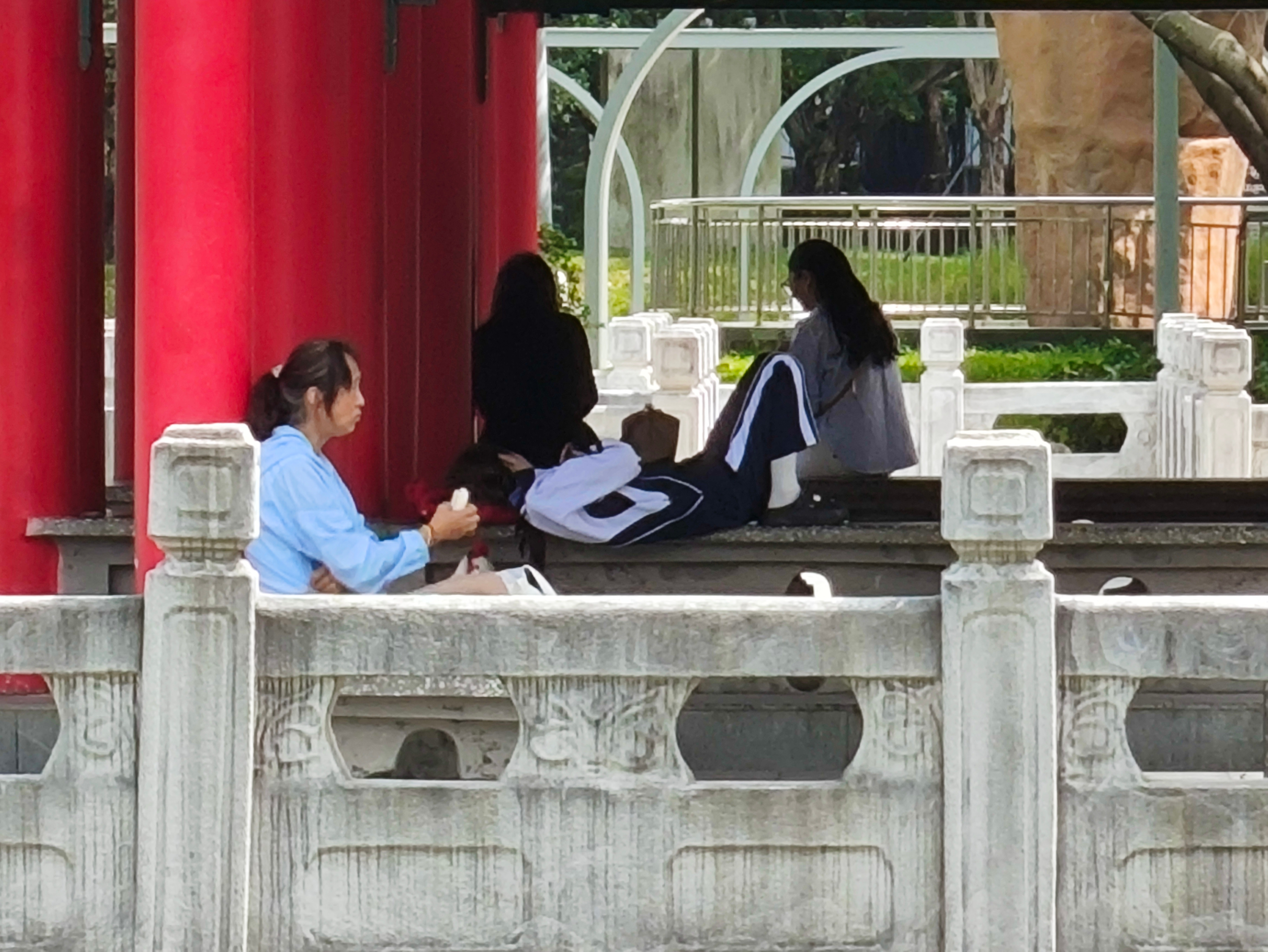 东莞一公园石凳密集扶手被拆除石凳上安装密集扶手没必要,装上又拆就是浪费资源。放置长凳就是给人休息的,不管是市民,还是流浪汉,可以坐,也可以躺。这是深圳龙园的情景,回龙桥上躺着的人更多。在长凳上躺着的,未必是流浪汉。下图中躺在长凳上的女孩子,看衣着是个中学生。
