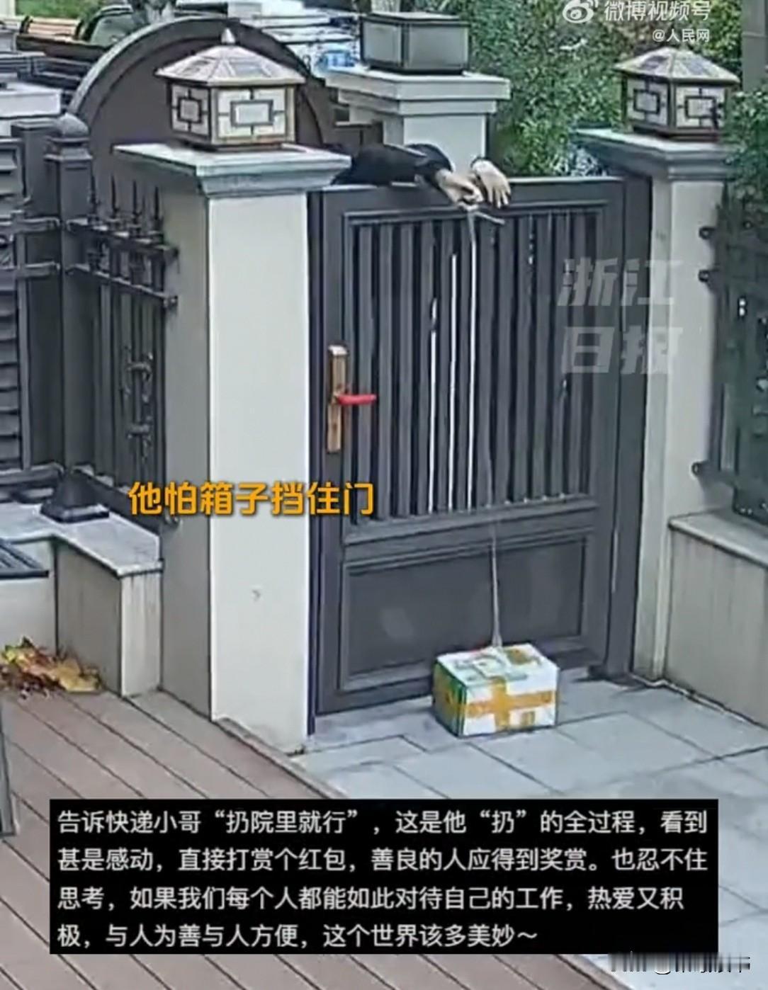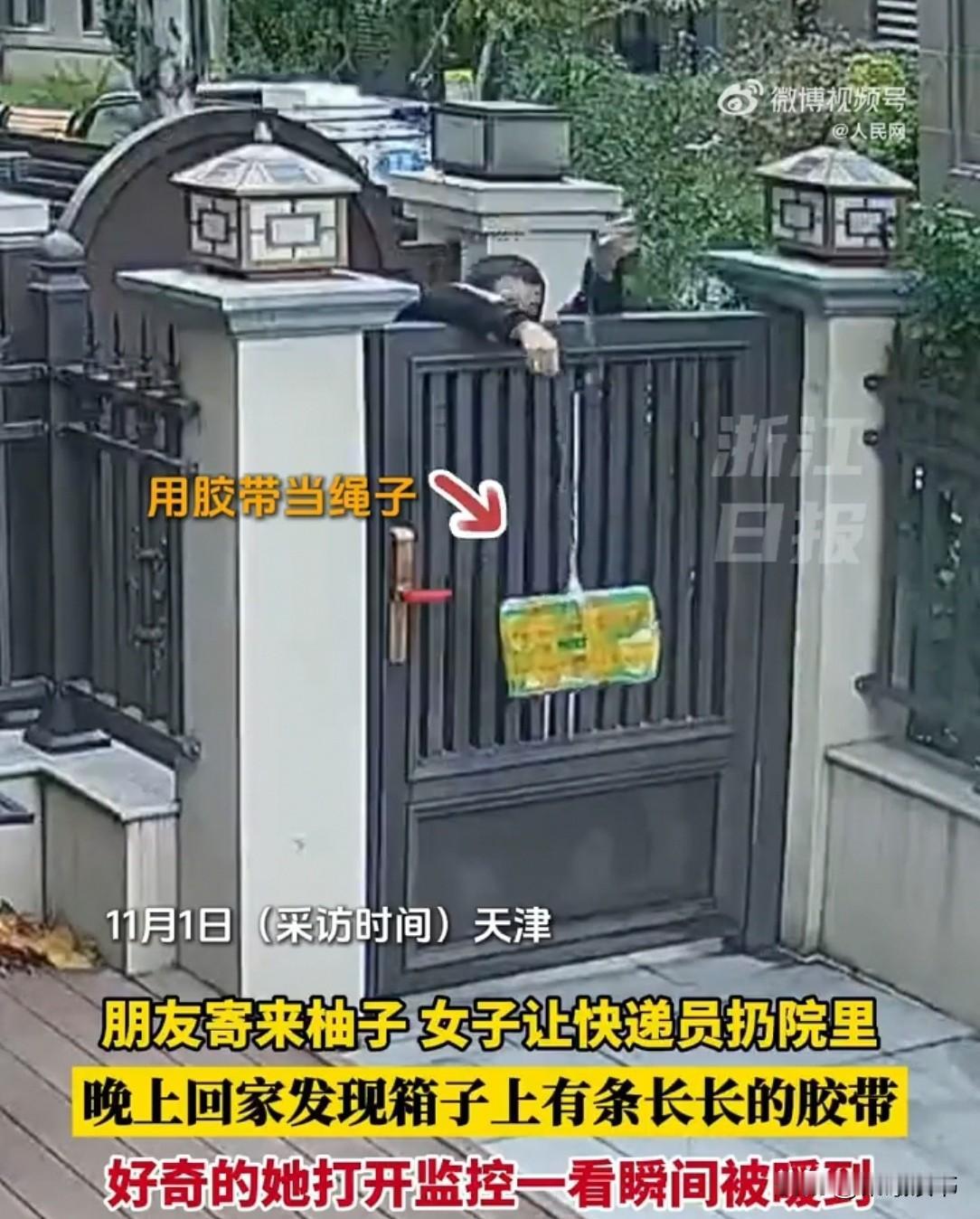 天津,一快递小哥站在一户紧闭的门前。门不高,抬手就能把件扔进去,可这件是箱水果,怕砸烂。犹豫过后,小哥选择这样做。 这天傍晚,天津一女子到了下班点后,风风火火往家赶。 刚推开大门,她就看见院子里的快递箱,眼睛一下子亮了。 “终于到了!这柚子我盯了好几天,回家就能剥一个吃,想想都甜。” 她赶紧关上大门,蹲下身想把箱子抱起来,手指却先碰到了箱子上那截多余的长胶带,心里顿时犯了嘀咕:“咦?这胶带怎么这么长?” 她把箱子抱到手里,上下左右翻着看,箱子四角都完好,没有半点破损,又核对了一遍收件人姓名和电话,的确是自己的。 “没破啊,贴这么长胶带干嘛?难道是中途打开过,又重新封的?” 女子皱着眉,手指顺着胶带边缘摸了摸,没发现拆过的痕迹,可心里的疑惑半点没少。 时间回到包裹送达之前,当时快递小哥给女子打电话,对方说是直接从门口扔院子里就行。 可快点小哥听后,却有些犹豫。 他看着眼前紧闭的铁门前,这门虽不算高,抬手就能把件扔进去,可这样一来,箱子里的水果难免会发生碰撞。 一想到柚子在箱子里砸得汁水横流的样子,他又把抬起的胳膊收了回去。 “扔进去倒是省事儿,可人家买的是水果,砸烂了多糟心。”他小声嘀咕着,指尖敲了敲快递箱,手指摩挲着箱子上的胶带,目光在铁门和地面间来回扫,心里犯了难。 琢磨了两分钟,他忽然眼睛一亮,从快递车上翻出一卷新胶带,撕了长长的一截,一端牢牢粘在快递箱顶部的提手处,另一端反复缠了几圈,攥在手里试了试拉力。“成,就这么办!” 他站起身,踮着脚把箱子举到铁门上方,胳膊绷得有些紧,生怕手一滑出意外。 就像钓鱼时放鱼线那样,他慢慢松开手指,胶带“钓鱼绳”一点点往下垂,眼睛死死盯着箱子。 眼看箱子快碰到地面,他又轻轻拽了拽胶带,调整方向,把箱子往旁边的台阶上荡了荡,直到确认箱子稳稳靠在台阶角落。 确保箱子不会挡着开门后,这才松了口气,转身骑上快递车,往下一户赶去。 看到快递小哥这钓鱼式的投递画面,女子终于明白那条长长的胶带是怎么回事了。 尤其是看到小哥特意把箱子荡到台阶角落,生怕挡路的样子,她忍不住笑了,指尖轻轻碰了碰屏幕:“原来这长胶带是‘钓鱼绳’啊,真是太贴心了!” 快递小哥用胶带“钓”下的,不仅是一箱柚子,更是沉甸甸的匠心。俗话说“与人方便,自己方便”,这截普通的胶带,因这份超越职责的细心变得温暖。 生活里最动人的,正是这些平凡人把小事做好的温柔瞬间。