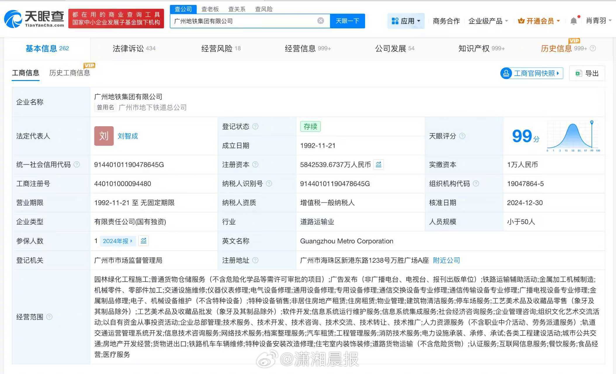 据记者查询,天眼查App显示,广州地铁集团有限公司成立于1992年11月,法定代表人为刘智成,注册资本约584.3亿人民币,经营范围包括广告发布、铁路运输辅助活动、城市公共交通等,由广州市人民政府全资持股。对外投资信息显示,该公司对外投资100余家企业,其中70余家处于存续状态,包括广东珠三角城际轨道交通有限公司、广州农村商业银行股份有限公司等。