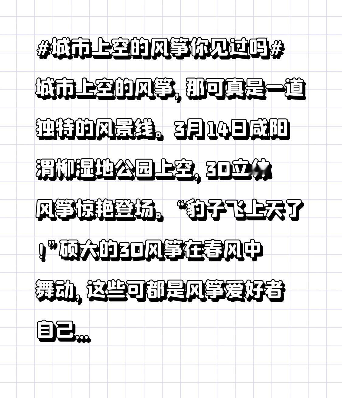 城市上空的风筝,那可真是一道独特的风景线。3月14日咸阳渭柳湿地公园上空,3D立体风筝惊艳登场。“豹子飞上天了!”硕大的3D风筝在春风中舞动,这些可都是风筝爱好者自己设计定制的,和常规风筝完全不同。市民们纷纷驻足,孩子们兴奋地追逐,现场满是欢笑声。还有杭州西湖,有人放飞杨幂造型风筝,网友直呼“太抽象”“被吓到了”。在城市里抬头看到这些造型各异的风筝,仿佛给平淡生活添了一抹奇幻色彩,让人忍不住感叹,原来城市上空还藏着这么多惊喜。