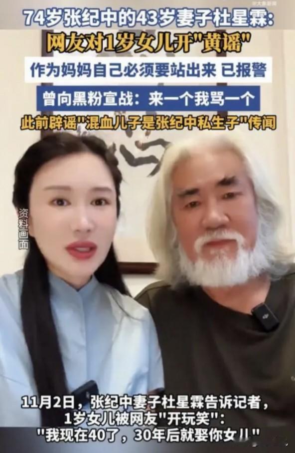 家人们谁懂啊!74岁导演张纪中晒1岁女儿小龙珠的庆生视频,本来是温馨幸福的场面,结果评论区直接变成“黄谣”和“性侮辱”的现场。 一群网友对着襁褓里的1岁娃娃喊“我现在40岁了,30年后娶你”“我60了可以娶你女儿”……这性暗示拉满的“求娶”,简直把“恶臭玩梗”焊死! 张纪中老爷子那叫一个硬核回怼,火力全开:“你先做你爹和外公的女婿!”“你外婆就是你丈母娘!” 怼得键盘侠哑口无言,这暴躁又护崽的样子,像极了村口护孙的爷爷,隔着屏幕都能感受到怒气值拉满! 本以为这波回怼能劝退妖魔鬼怪,结果没想到愈演愈烈!11月2日,张纪中老婆43岁杜星霖直接放大招:“已经报警!” 她直言这根本不是“玩梗”,是纯纯的“黄谣”+“性侮辱”,之前骂他们夫妻俩的恶评都忍了,但敢动她女儿?底线直接踩穿! 杜星霖这波“为母则刚”的操作,网友直接拍手叫好:“这才是护崽天花板!”“把成人的脏玩笑甩给婴儿,脸呢?” 对此大家怎么看? 图片源自网络。鸣谢!