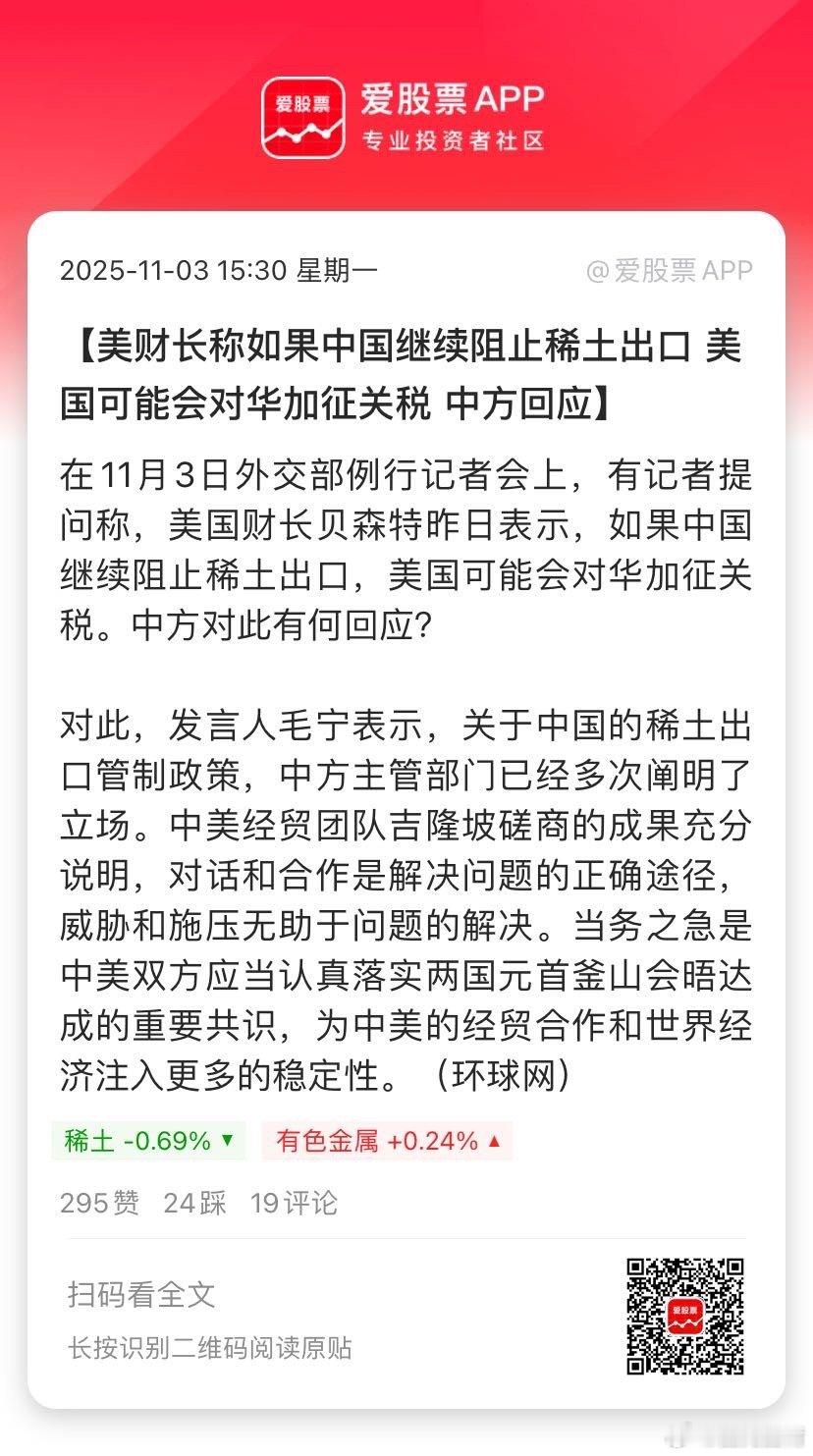 【美财长称如果中国继续阻止稀土出口 美国可能会对华加征关税 中方回应】在11月3日外交部例行记者会上,有记者提问称,美国财长贝森特昨日表示,如果中国继续阻止稀土出口,美国可能会对华加征关税。中方对此有何回应?