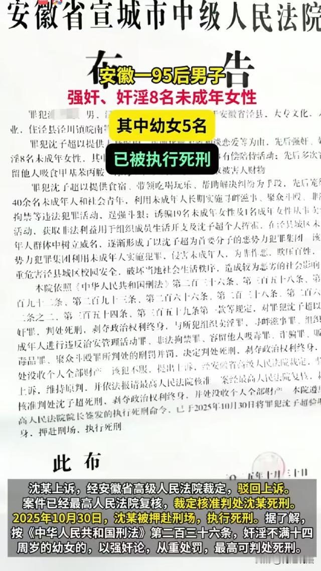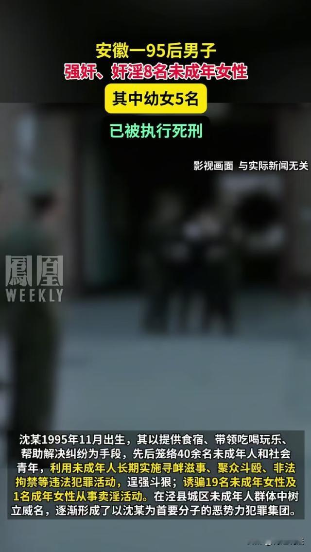 安徽宣城,95后男子沈某以提供食宿、帮忙解决纠纷、带领吃喝玩乐为由,纠集了40多名未成年,引诱19名未成年女性从事卖 淫活动,强 奸8名未成年女性,其中5人为幼女。近日,沈某被执行死刑。 沈某为95年生人,他不思进取,不想靠劳动生存,总想走捷径赚大钱。 此前,沈某称自己有关系,可以帮人解决纠纷,又以提供食宿,带他们吃喝玩乐为由笼络了一批未成年人和社会闲散人员。 有了一批小弟后,沈某非常享受这种前呼后拥的感觉,于是又操控这些人打架斗殴、寻衅滋事、非法拘禁他人,通过这些手段给人解决纠纷。 渐渐的,沈某手底下的人越来越多,他又引诱了19名未成年和一名成年女性从事卖 淫活动,沈某团伙在当地未成年人中有了很大的名气,形成了一个恶势力集团。 在此期间,沈某看到哪个女孩长得漂亮,就强 奸哪个,先后有8名未成年女性和沈某发生 关 系,其中5名还是幼女。 随着团队越发展越大,沈某没少敛财,为了赚更多钱,他还干起了诈骗、贩毒、容留他人吸毒等事,成为了黑恶势力的老大。 那么,沈某犯了什么罪? 沈某引诱19名未成年女性及1名成年女性从事卖 淫活动,此行为构成组织卖 淫罪。 《刑法》第三百五十八条规定,组织、强迫他人卖 淫的,处五年以上十年以下有期徒刑,并处罚金;情节严重的,处十年以上有期徒刑或者无期徒刑,并处罚金或者没收财产。组织、强迫未成年人卖 淫的,依照前款的规定从重处罚。 沈某以提供食宿、帮忙解决纠纷等手段,有组织地纠集多人从事卖 淫活动,形成恶势力集团,其行为性质恶劣,严重破坏了社会管理秩序和公序良俗,应在法律规定的量刑幅度内,结合其情节严重程度予以严惩。 沈某强 奸8名未成年女性,其中5人为幼女,构成强 奸罪。 《刑法》第二百三十六条明确规定,奸 淫不满十四周岁的幼女的,以强 奸论,从重处罚。强 奸妇女、奸 淫 幼女,有下列情形之一的,处十年以上有期徒刑、无期徒刑或者死刑,并处罚金或者没收财产:(一)强 奸妇女、奸 淫幼女情节恶劣的;(二)强 奸妇女、奸 淫幼女多人的。 沈某对多名未成年女性实施强 奸行为,尤其是对幼女下手,严重侵害了未成年人的身心健康和合法权益,其行为符合强 奸罪中加重处罚的情节,依法应予以严厉惩处。 此外,沈某操控他人打架斗殴、寻衅滋事、非法拘禁他人等行为,分别触犯了不同罪名。 根据《刑法》第二百九十二条规定,聚众斗殴的,对首要分子和其他积极参加的,处三年以下有期徒刑、拘役或者管制;有下列情形之一的,对首要分子和其他积极参加的,处三年以上十年以下有期徒刑:(一)多次聚众斗殴的;(二)聚众斗殴人数多,规模大,社会影响恶劣的。 沈某作为恶势力集团的首要分子,操控手下人员进行聚众斗殴,严重扰乱了社会公共秩序,应按照法律规定承担相应责任。 《刑法》第二百九十三条规定,寻衅滋事、破坏社会秩序的,处五年以下有期徒刑、拘役或者管制。 沈某指使手下寻衅滋事,严重破坏了社会秩序,必须受到法律制裁。 《刑法》第二百三十八条规定,非法拘禁他人或者以其他方法非法剥夺他人人身自由的,处三年以下有期徒刑、拘役、管制或者剥夺政治权利。 沈某通过非法拘禁他人来达到自己的目的,严重侵犯了他人的人身自由权利,同样要依法承担刑事责任。 此外,沈某还实施了诈骗、贩毒、容留他人吸毒等犯罪行为。 沈某的一系列犯罪行为相互交织,形成了一个严重危害社会的恶势力集团。他的行为不仅侵犯了众多受害者的人身权利、财产权利,还严重破坏了社会的管理秩序、经济秩序和公序良俗。 依据《刑法》第六十九条规定,判决宣告以前一人犯数罪的,除判处死刑和无期徒刑的以外,应当在总和刑期以下、数刑中最高刑期以上,酌情决定执行的刑期。 最终,沈某因强 奸罪被判处死刑,与组织卖 淫罪、寻衅滋事罪、组织未成年人进行违反治安管理活动罪、非法拘禁罪等八项罪名数罪并罚,判处沈某死刑,并没收全部个人财产。 沈某不服提起上诉,二审维持原判,目前本案经最高法核准,10月30日,沈某已被执行死刑。 来源:红星新闻,凤凰WEEKLY