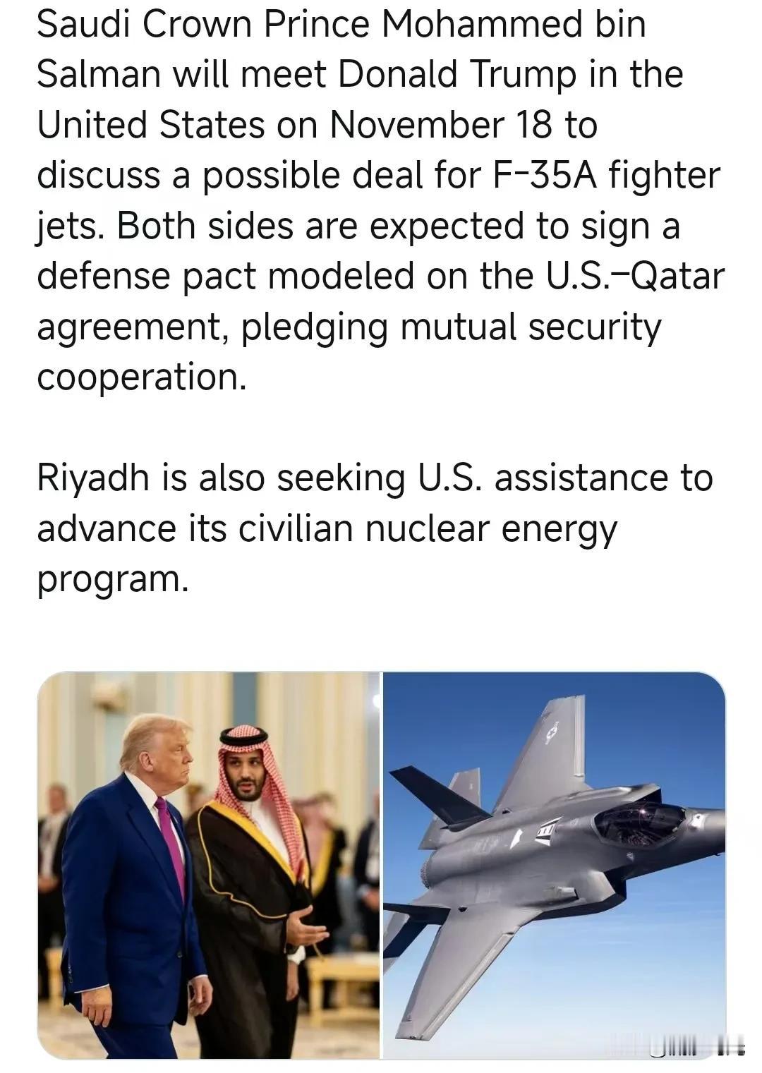 沙特王储穆罕默德·本·萨勒曼将于11月18日在美国会见唐纳德·特朗普,讨论F-35A战斗机的潜在交易。 双方预计将签署一项以美卡协议为蓝本的防务协议,承诺在安全领域开展合作。 利雅得也在寻求美国的帮助,以推进其民用核能计划。