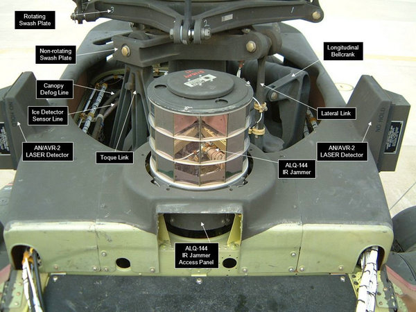 AN/ALQ-144红外干扰系统,美国BAE系统公司旗下的山德斯公司于上世纪70年代研制,用于为直升机和低速固定翼机提供保护。一般来说红外诱饵弹可以有效引开来袭导弹,但有效时间很短。如果飞机需要在危险地区长时间盘旋,或者飞行速度较慢,所需诱饵弹数量就不可接受,这类干扰机就可以提供一个长时间的持续保护。 AN/ALQ-144通过电力加热碳化硅的方式产生红外信号,以围绕它的圆柱形机械快门调制出脉冲信号,干扰导弹瞄准系统的锁定以阻止发射,同时可使已发射导弹的导引头产生误判,从而偏离目标飞机。因其独特外形,AN/ALQ-144常被称为迪斯科灯球。