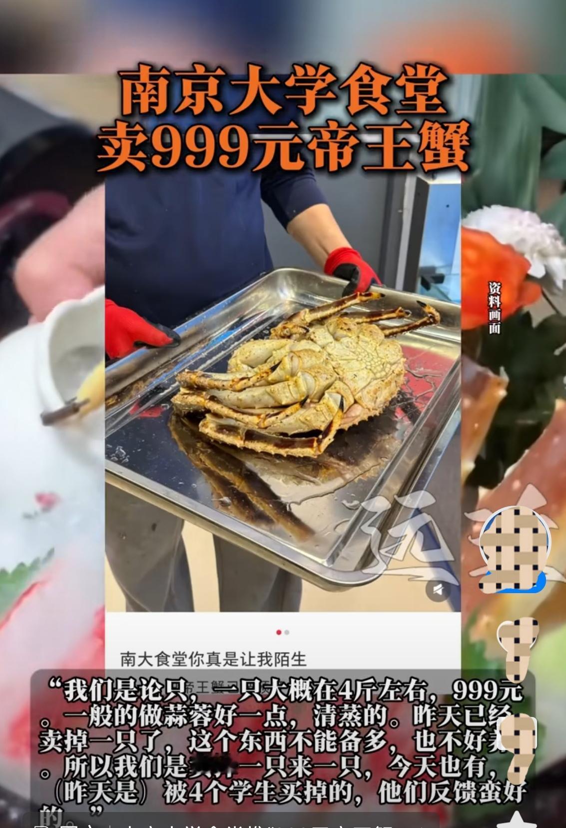 大学食堂开始卖帝王蟹了 近日,多位网友发帖爆料称,国内某大学食堂11月1日以999元单只的价格上架一款高端海鲜并面向学生售卖 该大学涉事食堂负责人表示,帝王蟹实为该食堂新开海鲜档口的常规菜品,并非因学生留言特设,且帝王蟹价格低于市场价,目前学生反馈积极 大学开售帝王蟹,消息一出引发广泛热议,有学生为学校点赞,也有网友质疑,高校食堂提供这种高价菜品是否合适 大家怎么看呢?欢迎发表评论 .