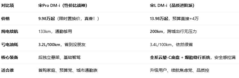 10-15万预算买混动SUV?宋L DM-i vs 宋Pro DM-i!看完这篇别再纠结! 兄弟们,比亚迪这回双车齐发真是给力,但也让不少朋友犯选择困难症了!💰 预算10-15万,2026款宋Pro DM-i和宋L DM-i到底该怎么选?作为深度体验过实车的老司机,一句话帮你划重点: **✅ 追求极致省钱,选宋Pro DM-i! ✅ 追求续航品质,选宋L DM-i!** 坦克300 【怎么选?真人说真话】 看钱包!刚性预算选宋Pro! 如果你手头紧,或者就想买台“代步神车”,宋Pro DM-i的9.98万起价格简直是王炸!日常用电每公里不到1毛钱,加油也才3.2L/百公里,用车成本低到笑醒。🚀 注意:这个神价一般需要置换补贴,下单前找销售确认清楚! 看里程!长途多选宋L! 如果你每天通勤超50公里,或经常周末跨城玩,宋L DM-i的200km纯电续航绝对是硬通货!充电次数少一半,远门出行更从容,纯电就能覆盖大部分场景。🛣️ 看体验!要质感选宋L! 云辇-C智能底盘过坑过坎如履平地,座椅通风加热按摩配齐,还有贴心冷暖冰箱…这4万差价换来的舒适升级,坐过的人都懂!尤其有娃家庭,老人孩子坐着不晕车,这钱花得值!👨👩👧 【老司机总结】 宋Pro DM-i:省钱省心,入门即高配,闭眼入不亏! 宋L DM-i:预算加4万,续航、安全、舒适全面飞跃,长期用更享受! 最后建议: 别光看参数!一定去4S店试驾! 亲自开一圈,过个减速带,你立马知道哪台适合你! 投票互动: 10-15万预算,你会冲宋Pro还是加钱上宋L?评论区见!👇 比亚迪 宋ProDMi 宋LDMi 混动SUV怎么选