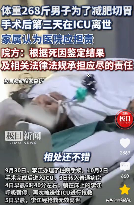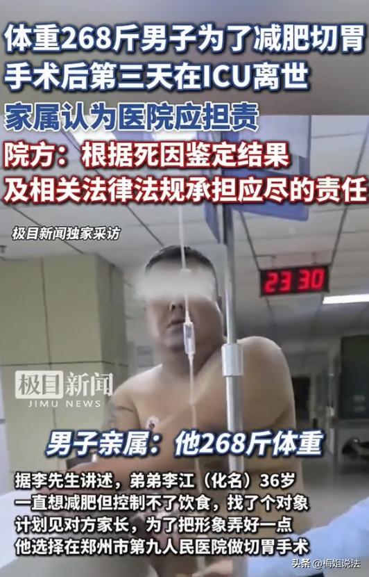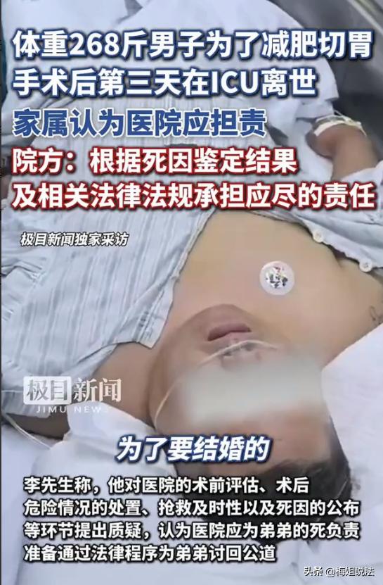 河南郑州,男子大龄未婚,体重更是高达134公斤,后来终于谈了个对象,准备谈婚论嫁时怕对象父母嫌弃,决定开始减肥。在得知切胃手术能快速减肥后,男子欣然同意并成功进行手术,不料就在术后两天男子突发呼吸暂停、意识丧失,抢救无效后死亡。家属愤怒要求赔偿,院方的态度让人意外。 近日,极目新闻报道了这则268斤男子为了减肥结婚,在切胃手术仅三天后离世,院方坚称规范操作的新闻,事情的经过是这样的。 因为长期暴饮暴食,加上饮食不规律,今年36的小李(化名)体重高达268斤,同时伴有高血压、高血脂、脂肪肝及睡眠呼吸暂停综合征等一系列并发症,这样的体重别说正常工作生活了,找对象更是遥遥无期。 看着一起长大的同学和发小,如今都老婆孩子热炕头了,自己还是孤家寡人,小李决定开始减肥、锻炼身体,希望恢复正常的生活。 也许是小李的决心感动了上天,一段时间后小李成功的找了个对象,很快两人就到了谈婚论嫁的地步。 心里高兴的同时,小李感觉更多的还是焦虑,自己这副大腹便便的样子,女友虽然不嫌弃,但要是未来的岳父岳母不满意自己的形象,拒绝了这门婚事,那就一切全毁了。 想想这也是人之常情,为人父母肯定都是希望自己的女儿幸福,嫁给一个疼爱她的丈夫。可如今小李的形象确实不怎么好,整个人看上去胖胖的没有气质不说,还伴随严重的三高,怎么看都不像是个“合适”的丈夫。 原来小李虽然下定决心减肥并开始行动,但减肥都有个戒断的过程,特别是刚开始的时候,不仅整个人会感觉到很累,体重也不会很快的下去,只有度过开始最难熬的时刻,体重才能快速的下降。 机缘巧合下小李看到了某机构医美减肥的广告,对方声称在实施“腹腔镜下垂直袖状胃切除术”后,不仅可以快速的减肥,而且到时候饭量小了,还能有效的杜绝反弹。 九月三十号这天小李办理了入住手续,并进行了各项检查,最终在十月二号开始了手术。 整个手术十分顺利,术后小李被送到ICU观察,持续两天没有异常后,被转到了普通病房继续调养。 就在小李憧憬着快速减肥和婚后的幸福生活时,意外发生了,在十月四号凌晨六点五十分的时候,小李突发呼吸暂停,随后很快丧失了意识。 虽然医护人员及时发现并进行了紧急抢救,但小李还是在次日的凌晨七点三十六分宣告不治,带着满腔的遗憾离开了,最后诊断的死因是呼吸衰竭导致。 小李父母得知消息后直接哭成了泪人,怎么也想不到儿子只是为了结婚减肥,简单的做个胃切除手术后,就这样不明不白的离开了他们。 小李的哥哥在安慰父母后,对院方的术前评估、术后监护及抢救及时性,提出了强烈质疑,认为正是他们的管理上存在明显疏漏,这才导致亲弟弟不幸离世。 对此院方表示,对于小李的不幸离世深表遗憾,但胃切除手术和后续的抢救过程,全部都符合医疗规范。 其实260多斤,对于普通人来说确实算胖的,但在真正的胖子群体面前,还真不算胖,真不该为了图快,而去做那个什么胃切除手术,最终白白丧命。 那么,从法律角度,如何看待这件事呢? 根据《民法典》第一千二百一十八条规定:“患者在诊疗活动中受到损害,医疗机构或者其医务人员有过错的,由医疗机构承担赔偿责任。” 其中过错责任原则需满足三个要件:自身遭受实际损害(如病情加重、伤残等)、医疗机构或医务人员存在过错(如误诊、操作违规、护理不当等)、过错与损害结果之间存在直接因果关系。 该事件中如果院方在手术前,没有充分告知小李及其家人高血压、高血脂、重度睡眠呼吸暂停综合征等合并症,和“术前合并重度睡眠呼吸暂停综合征”等术后风险,导致他们对手术的后果没有充分的认识,或者手术过程中存在严重过程,但没有及时处理并告知患者,这样医疗机构就要承担相应的赔偿责任。 此外,根据《民法典》第一千二百一十九条规定:医务人员在诊疗活动中应当向患者说明病情和医疗措施;需要实施手术、特殊检查、特殊治疗的,应当及时向患者具体说明医疗风险、替代医疗方案等情况,并取得其明确同意;不能或者不宜向患者说明的,应当向患者的近亲属说明,并取得其明确同意。未尽到前款义务,造成患者损害,医疗机构应当承担赔偿责任。 小李在结束手术并在ICU观察两天,随后转到普通病房仅一天就突发呼吸暂停,有可能是院方没有对小李术后的身体恢复情况,作出一个正确的判断,从而过早的降低了监护等级。 更关键的是小李在突发呼吸暂停时,医护人员有没有第一时间发现,并采取相关措施;在抢救过程中是否有及时通知小李家属,并取得其明确同意。 这意味院方如果想要主张免责,就要证明其全部医疗行为和小李的死亡没有直接因果联系,否则就要承担举证不利的后果。 目前,院方坚称手术过程和事后抢救过程,全部符合规范,并启动了第三方尸检鉴定程序;小李家属也准备通过法律维权 不管最后的结果是什么,悲剧已经发生,那么,对于这事你怎么看?