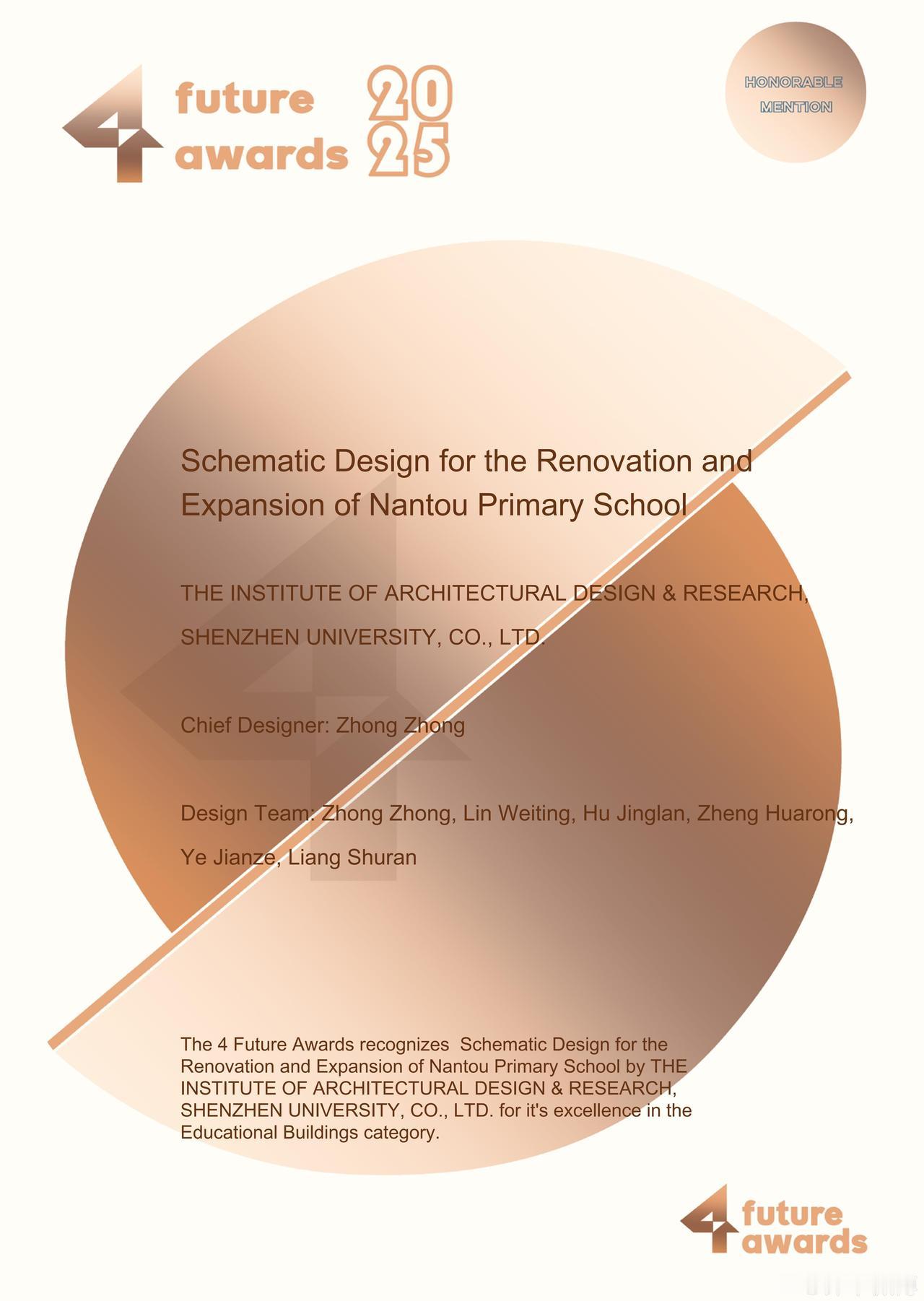 周一上班就收到了“深圳市南头小学改扩建(竞赛方案)”获得 2025 加拿大 4 Future Awards 教育建筑类别荣誉提名奖 Honorable Mention 带竞赛方案组名单的获奖证书电子版再次恭喜我们工作室的竞赛方案组全体:钟中、林玮珽、胡镜澜、郑华容、叶建泽、梁舒然深大建筑深圳大学建筑设计研究院有限公司钟中+钟波涛工作室建筑设计
