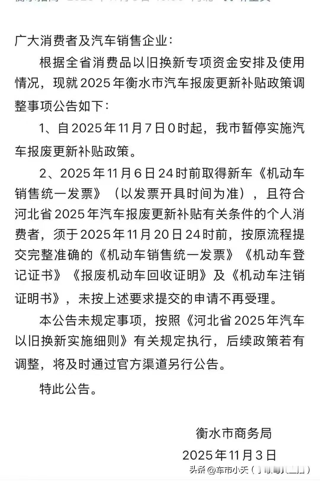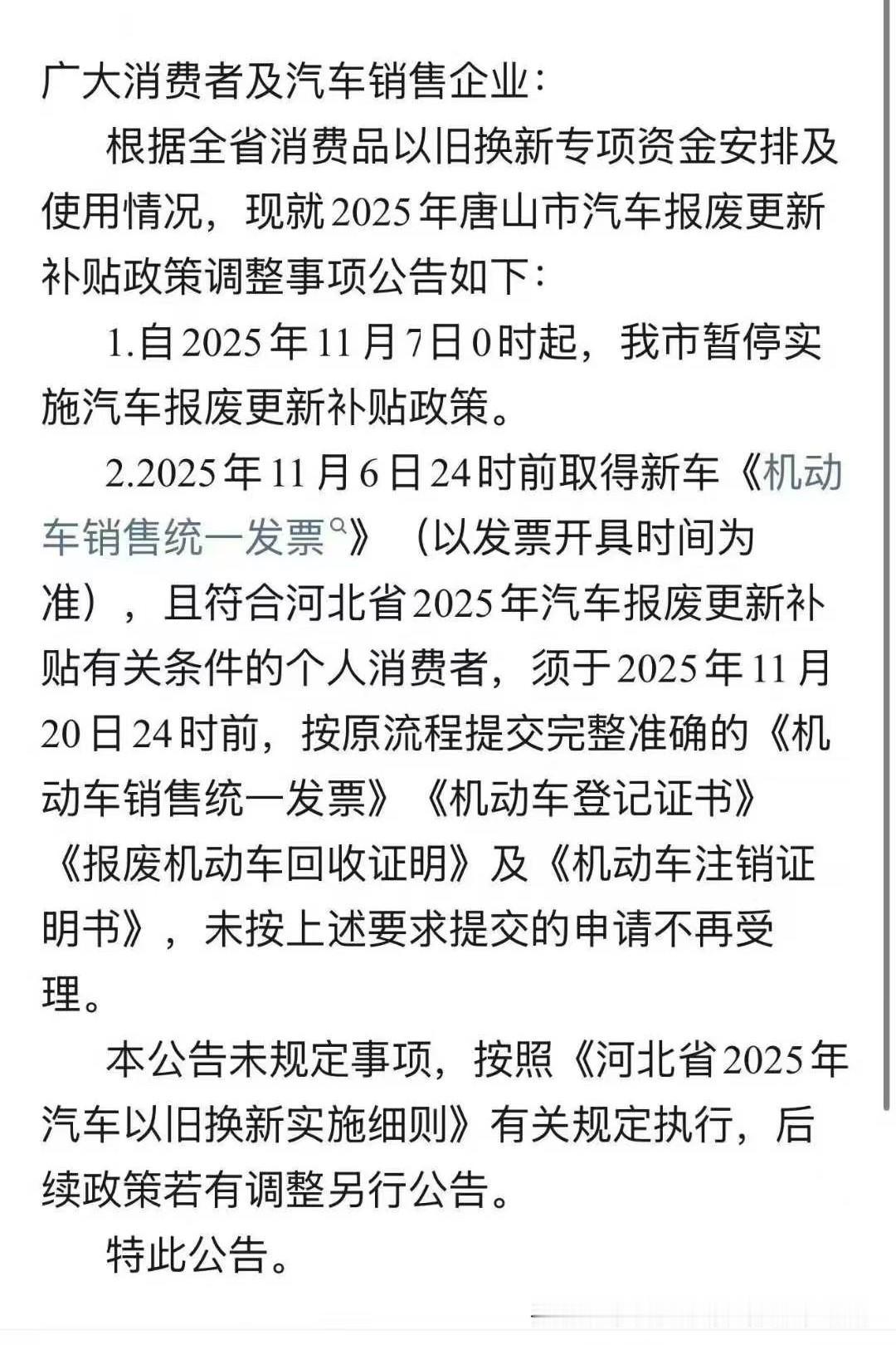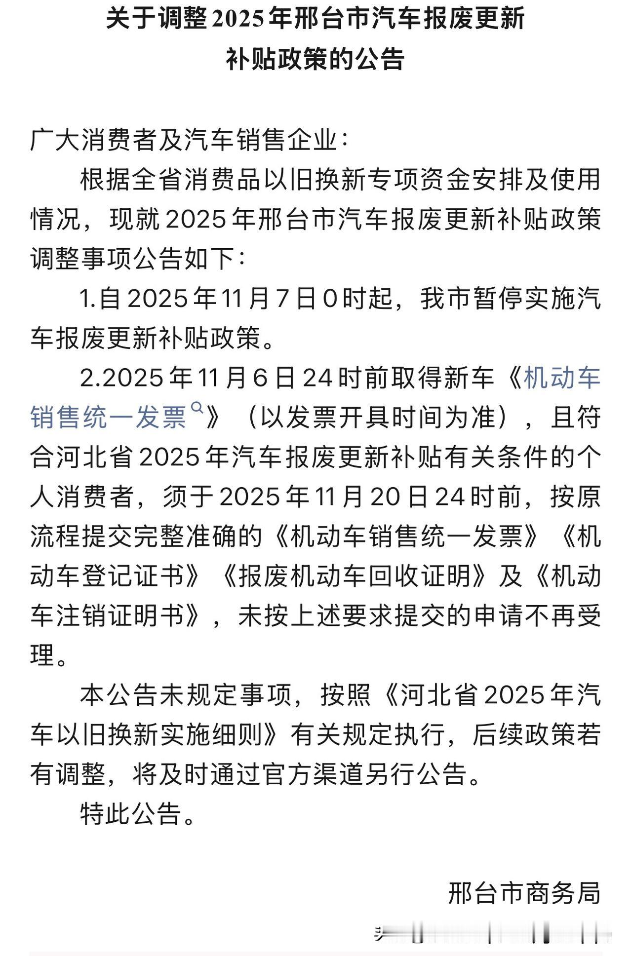 河北省的沧州、唐山、衡水和邢台市商务局今天相继发布公告,报废补贴将于2025年11月7日结束。同时要求已经取得《机动车销售统一发票》的用户,要在11月20日前上传所有资料。 河北大概率应该全省都要停,因为之前山东就是一开始只有几个市停掉报废补贴和省补,随后扩大到全省。
