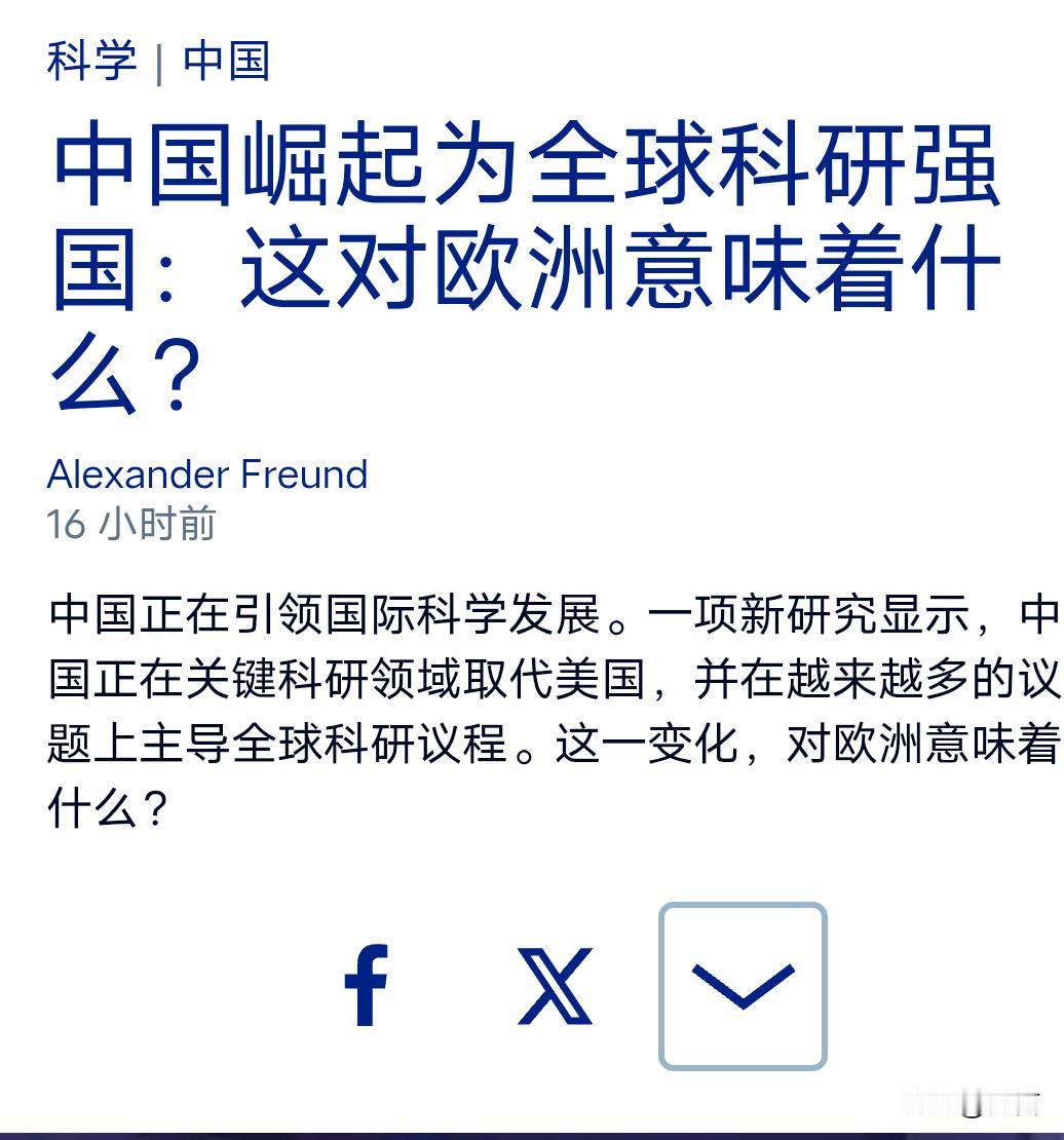 加速崛起!德媒:中国正在引领国际科学发展。 11月2日,德国媒体以《中国崛起为全球科研强国:这对欧洲意味着什么?》为题,介绍了中国科技快速崛起的原因和创新能力等,并预测:最晚不超过3年,中国将在人工智能、半导体研究、材料科学等战略领域将与美国并驾齐驱。 德媒认为,在这场科技竞争中,欧洲已经被甩在了后面。要想成为与中美两国平起平坐的科研中心,只有发挥自身优势、整合有效资源,并加强合作等。 我国科技的突破速度是有目共睹的,不单方面突破、而是全方位的。尤其是前沿学科领域,很多都处于领先地位,科研成果、论文数量和质量等都将其它国家甩在了身后,例如:根据最新“自然指数”论文期刊发表排名,前十的机构中,有七家是来自中国。 当然,不止是德媒,其他外媒也在争相报道中国科技的最新进展等。因为,老外们意识到已经被超越,且差距会被逐步拉大…