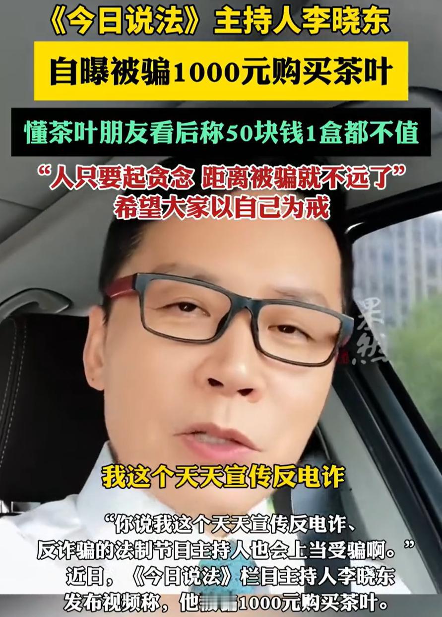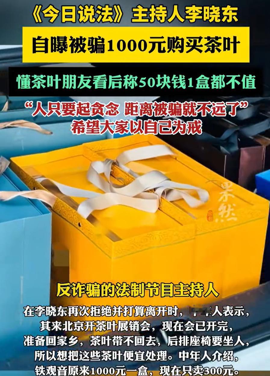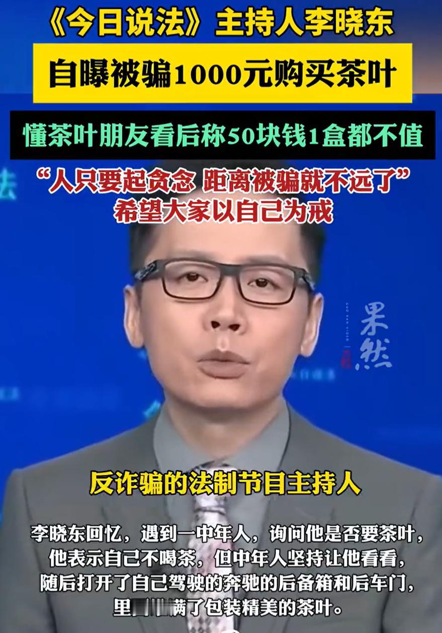 “防不胜防!”北京,《今日说法》主持人李晓东在网上分享了一段自己被骗的经历,在路边看到有人开奔驰车卖茶叶,最终没抵住低价的诱惑,花1000元买了5盒铁观音,可事后找朋友一问,才知道自己被骗了,一盒茶叶的成本连50块都不值 据李晓东描述,当天他去银行办完事,正准备上车走,一个开着奔驰的中年男人上前搭话,问他要不要点茶叶。奔驰车、精致包装、展销会库存处理,这几个关键词放在一起,换谁都容易放松警惕 李晓东开始也没打算买,直到对方说原价一千的铁观音,现在只要两百。最后,他心里打了个算盘,反正便宜,就买了五盒 可回到家后他突然回过味,总觉得事情有些蹊跷,结果找懂茶的朋友一看,说这茶加了香精,根本喝不得,一盒成本连五十都不值 对此,有网友表示:今日说法改现身说法?一个天天普法的结果也被骗了 这话说出来,确实让人有些苦笑,李晓东是天天讲案件、分析套路的人,结果自己也被骗,这让人既觉得讽刺,又觉得有点人情味。因为这事证明,不管你多懂法、多理智,只要被“便宜”和“可信外表”一夹击,也会掉进坑里 从心理上讲,骗子最懂的不是法律漏洞,而是人性的漏洞。李晓东这次就是被“信任感”拿下的——奔驰车、展销会、包装高端,这些元素堆在一起,足够让人暂时放下防备。很多人被骗,其实不是因为贪,而是因为觉得“像真的”。就像看见穿西装的人递名片,总觉得他靠谱,哪怕名片上印的公司根本不存在 由此可见,防骗不只是靠知识,还要靠一点冷静。看到太划算的买卖,先别急着掏钱。看似吃亏一秒,可能少掉一场坑