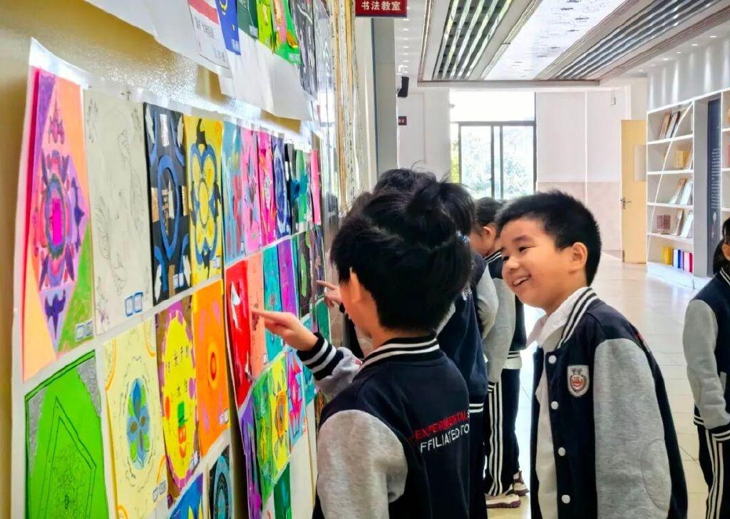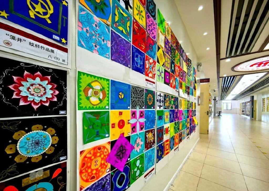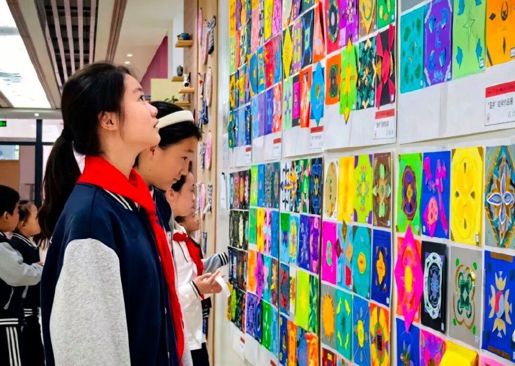 在东华附校,校园空间大变身的例子随处可见。这学期,师生联合策划的藻井纹样作品展在教学楼廊道上的艺术空间上线。学生才华展示有了舞台的同时,也为“下课去哪玩”提供了选择。 该艺术空间名为“经纬万象+造型空间”,位于学校4号楼3层,美术专用教室也分布于此。师生出了教室就能看展。廊道墙面就是展示艺术作品的空间,书法、陶瓷等艺术作品均陈列于此。步入廊道,八年级学生的藻井纹样作品占了半壁江山,足足有200余幅,手绘、剪纸等形式均有。教师也主导设计了AI藻井纹样动态视频,开发了藻井纹样魔方等。 东华附校美术教师王飞宇介绍,藻井是以彩绘或雕刻的形式,装饰在石窟顶部的构件。一般为方形或圆形,整体造型呈下宽上窄的井状,层层叠加向上收进。这类结构的纹样多以藻纹为主,“藻”即水藻,古人取“水能克火”的寓意,将其绘于屋顶以寄托防火祈愿。新推出的藻井纹样作品展脱胎于美术课《丝路回望》。 “这样的展出,既能为孩子们提供展示平台,又能对课堂内容进行深度延展。”王飞宇说,策展征集令发出后,学生热情高涨,除了用心制作个人作品,也为布展提供了许多思路。从最终呈现的作品来看,不少学生在领悟藻井纹样要义的同时,还在创作中融入了电影、动漫等元素。八(3)班学生许子涵的作品就是代表。“我的这幅作品融入了我喜爱的球队,因为它的队徽是圆形的,周围旋转的字符既代表它的名字,也符合藻井的设计理念。”许子涵说。 从美术课堂到廊道艺术空间,不仅激发了学生的学习和创作热情,也丰富了校园文化,让孩子们的校园生活更加多姿多彩。采访当天,正巧碰到五(7)班学生张乐颐和与俞晓瑜组团逛展,两人认为,“课间休息过来逛逛蛮好的,很放松。”五(11)班学生窦思羽说:“我上社团课的位置也在这一层,每次下课路过这里都会驻足一会儿,新上的藻井纹样令人震撼!” “校园空间合理利用,使得展示、交流成为常态,空间育人的功能也得以凸显。”东华附校副校长曹影梵介绍,“经纬万象+造型空间”每隔一段时间就会更新一次,主题和创意均由师生决定。学校配合空间再利用推出的“校园策展人”实践项目也很火爆,从作品创作者升级为展览策划者,孩子们日常可以自主参与展品排布、展区设计、讲解引导等环节,真正成为校园文化的主导者与传播者。