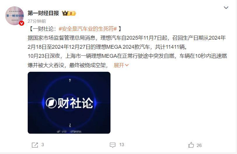最近第一财经很活跃啊,DISS小米之后又来点评理想MEGA起火事件,不浪费每一个热搜话题吗