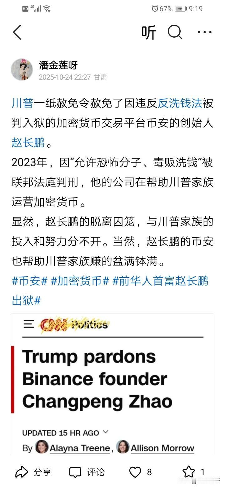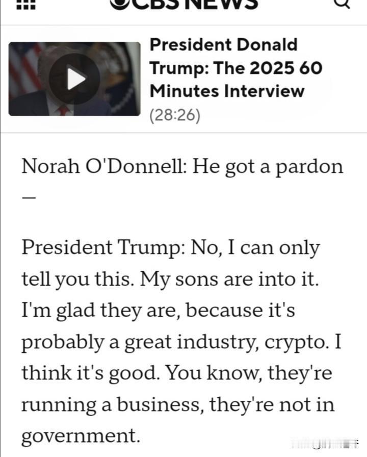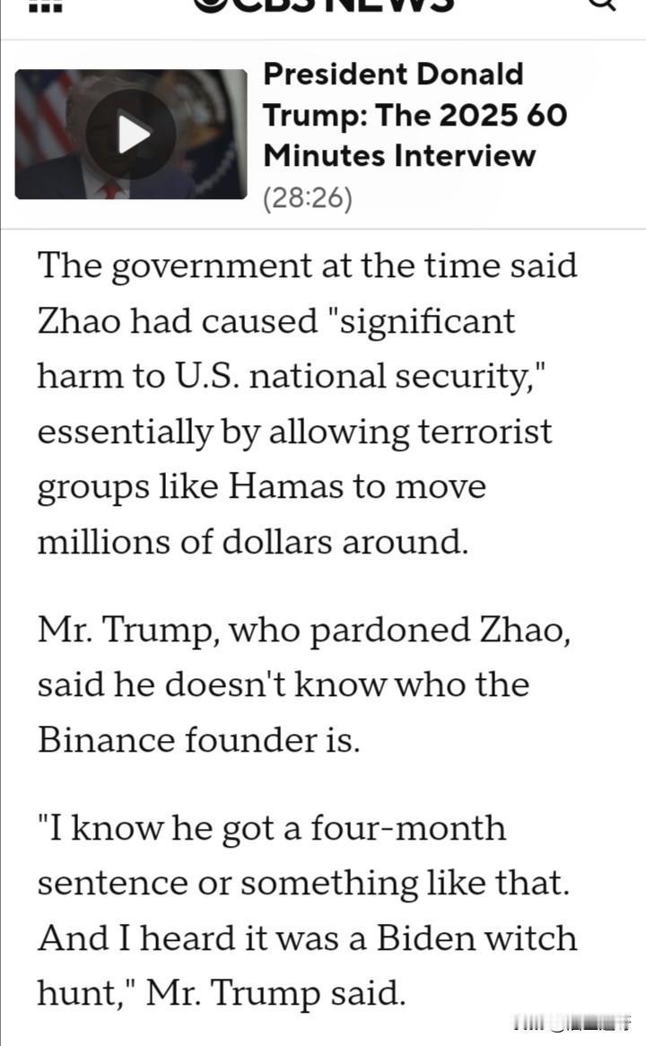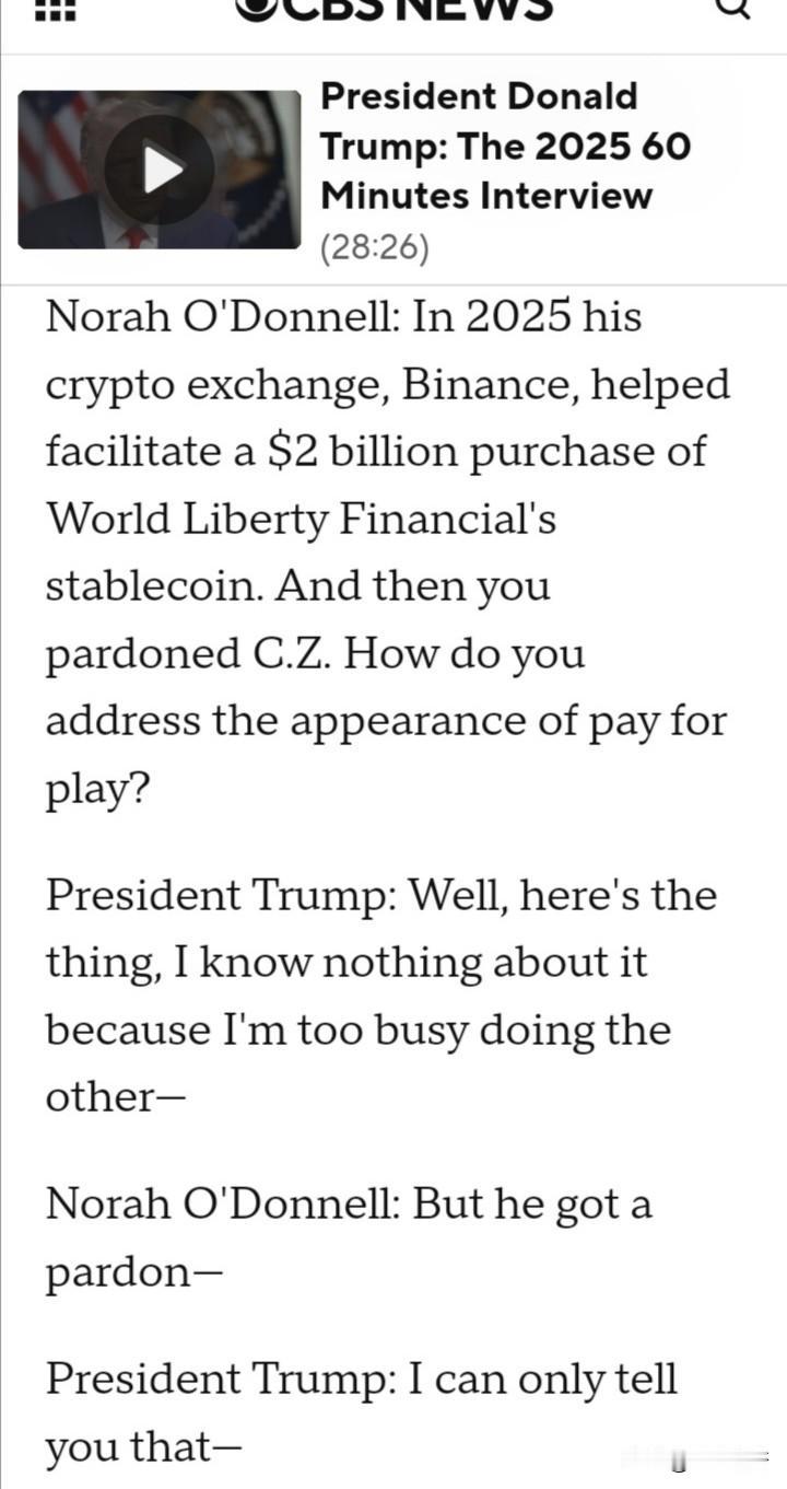 川普接受CBS新闻60分钟访谈,谈到加密货币交易所币安创始人赵长鹏, 🖊记者问:你为什么赦免赵长鹏? 📢川普:我根本不知道他是谁。 🖊记者:他的加密货币交易所协助促成了你的家族的金融公司20亿美元的稳定货币交易,随后你赦免了他,这看起来是不是有点问题? 📢川普:我对这事一无所知,我很忙。 🖊记者:可你确实赦免了他。 📢川普:加密货币都是我儿子他们在弄,他们不是政府人员,加密货币挺好的,他们是在做生意。 🤷用厚颜无耻来形容川普已经不够了。 加密货币 币安