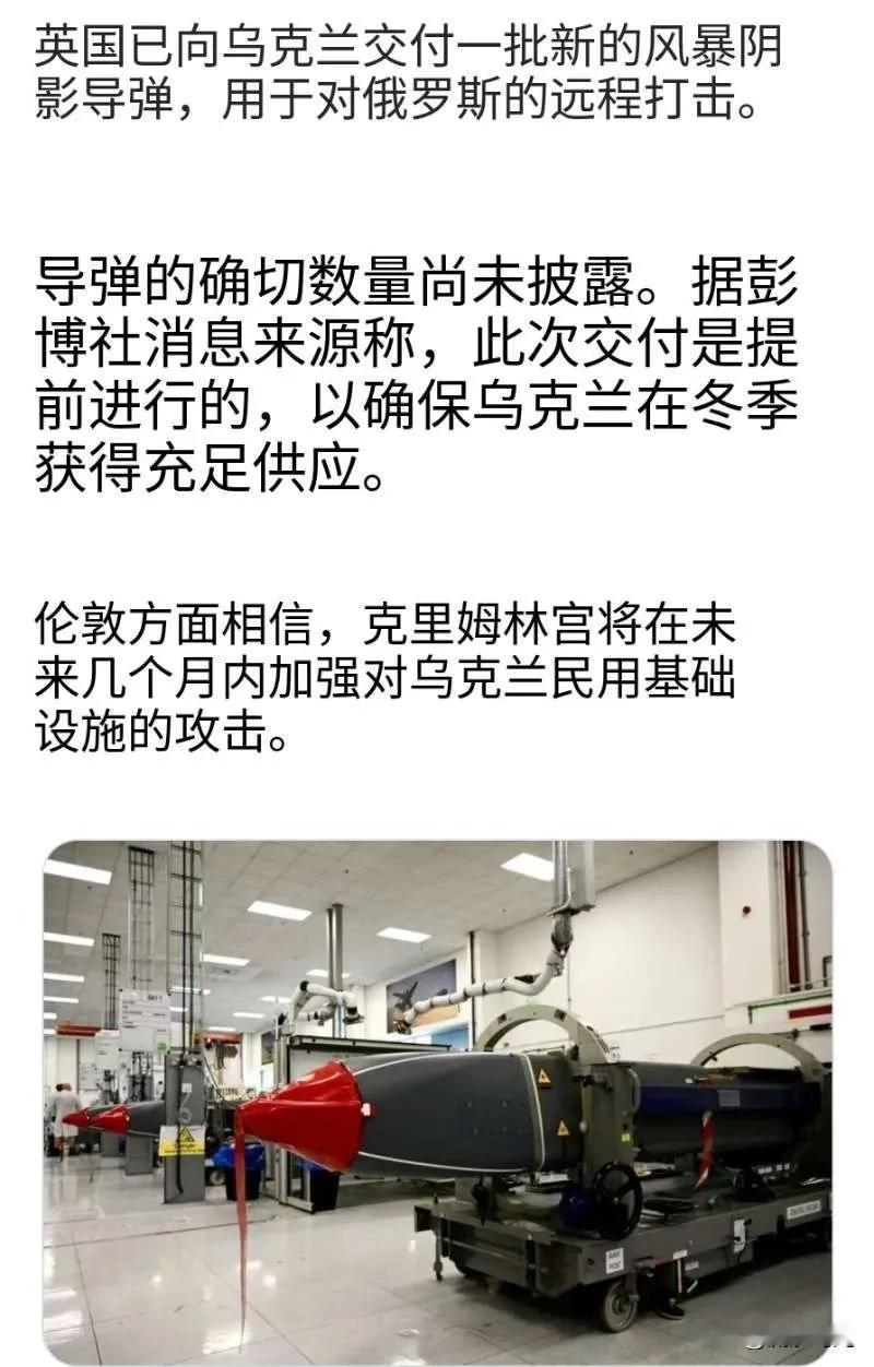 英国已向乌克兰交付了一批新的“风暴阴影”导弹,用于对俄罗斯进行远程打击。导弹的具体数量尚未公布。 据彭博社消息人士透露,此次交付是提前进行的,目的是确保乌克兰冬季物资供应充足。 伦敦方面确信,克里姆林宫将在未来几个月加大对乌克兰民用基础设施的袭击力度。