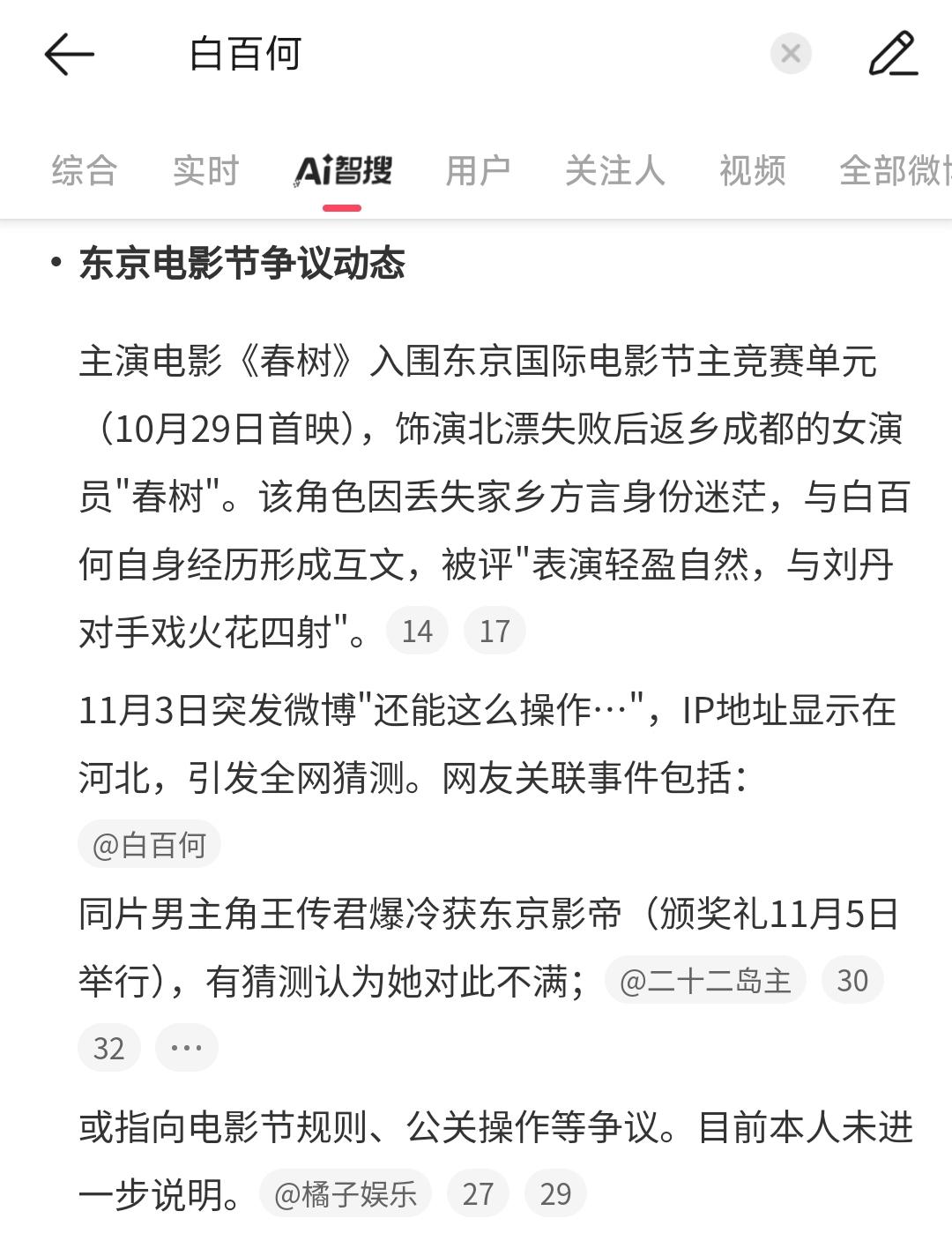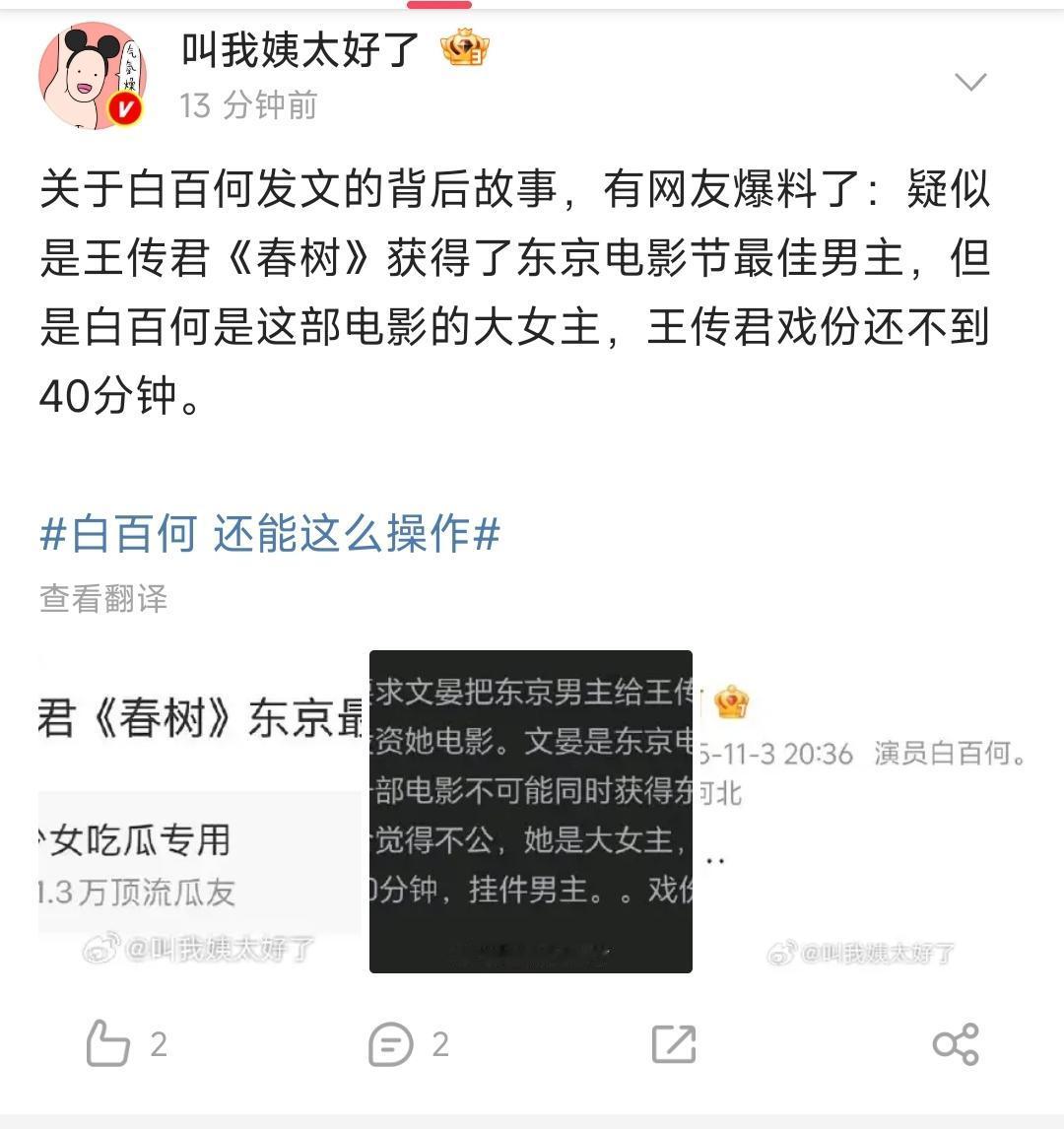 睡前吃了一个小瓜,女明星白百何在自己账号上莫名其妙的说了半句话,来了一句 还能这么操作。 这话没头没尾,别人看得莫名其妙,但是在评论区里疑似有知情人,爆料了一些内幕 好像是关于白百合主演的电影春树,入围东京国际电影节,白百合自己没拿奖,反而是戏份不多的男主王传君要拿奖。 白百何在娱乐圈里叱咤风云这么多年,估计也是第一次看到这样的操作,所以有些蒙圈了