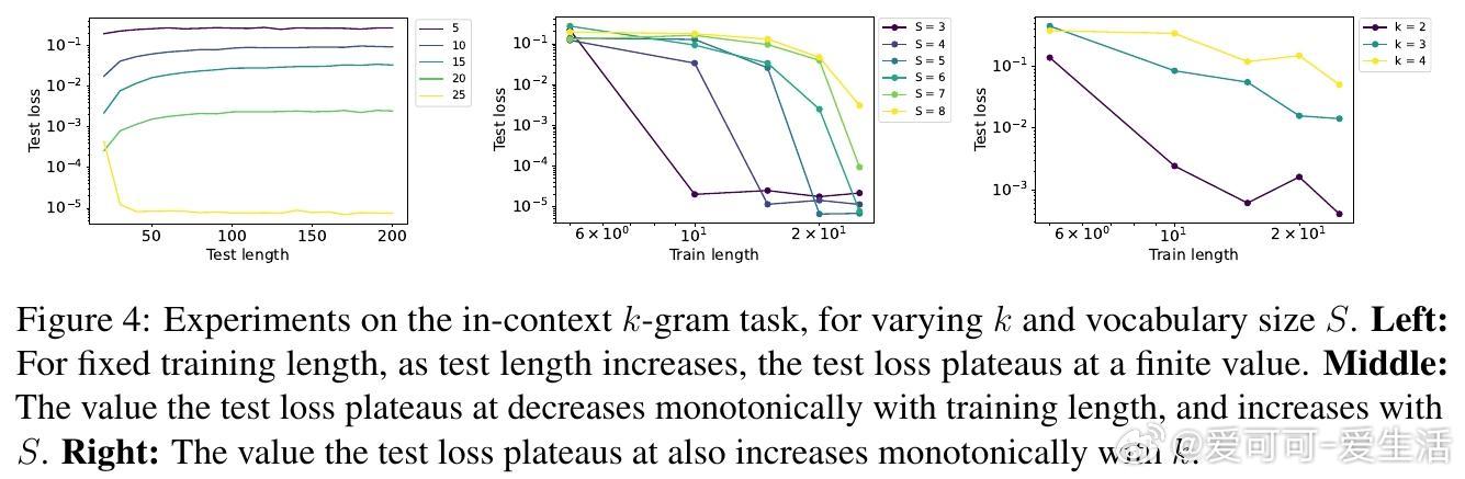 - 两层Transformer在in-context k-gram任务上的测试结果进一步印证了复杂度度量对训练长度的影响。