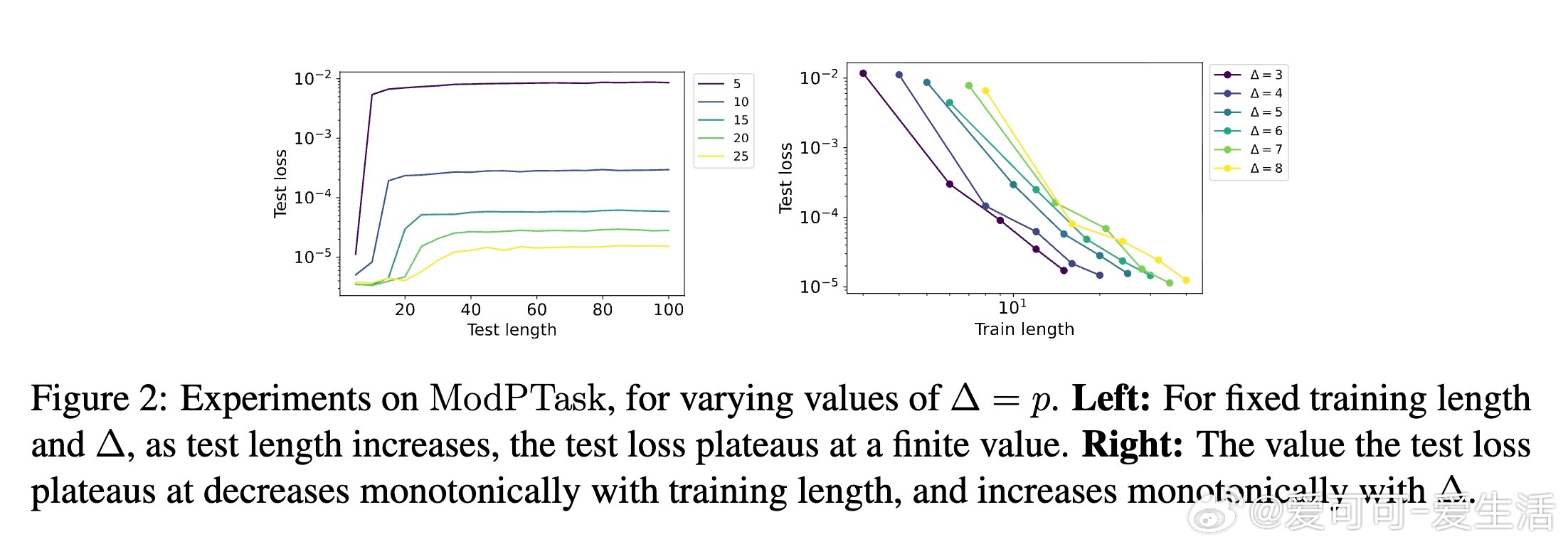 - 观察到随着训练长度增加,模型在更长测试序列上的误差趋于稳定且下降,支持训练长度对泛化能力的决定性作用。