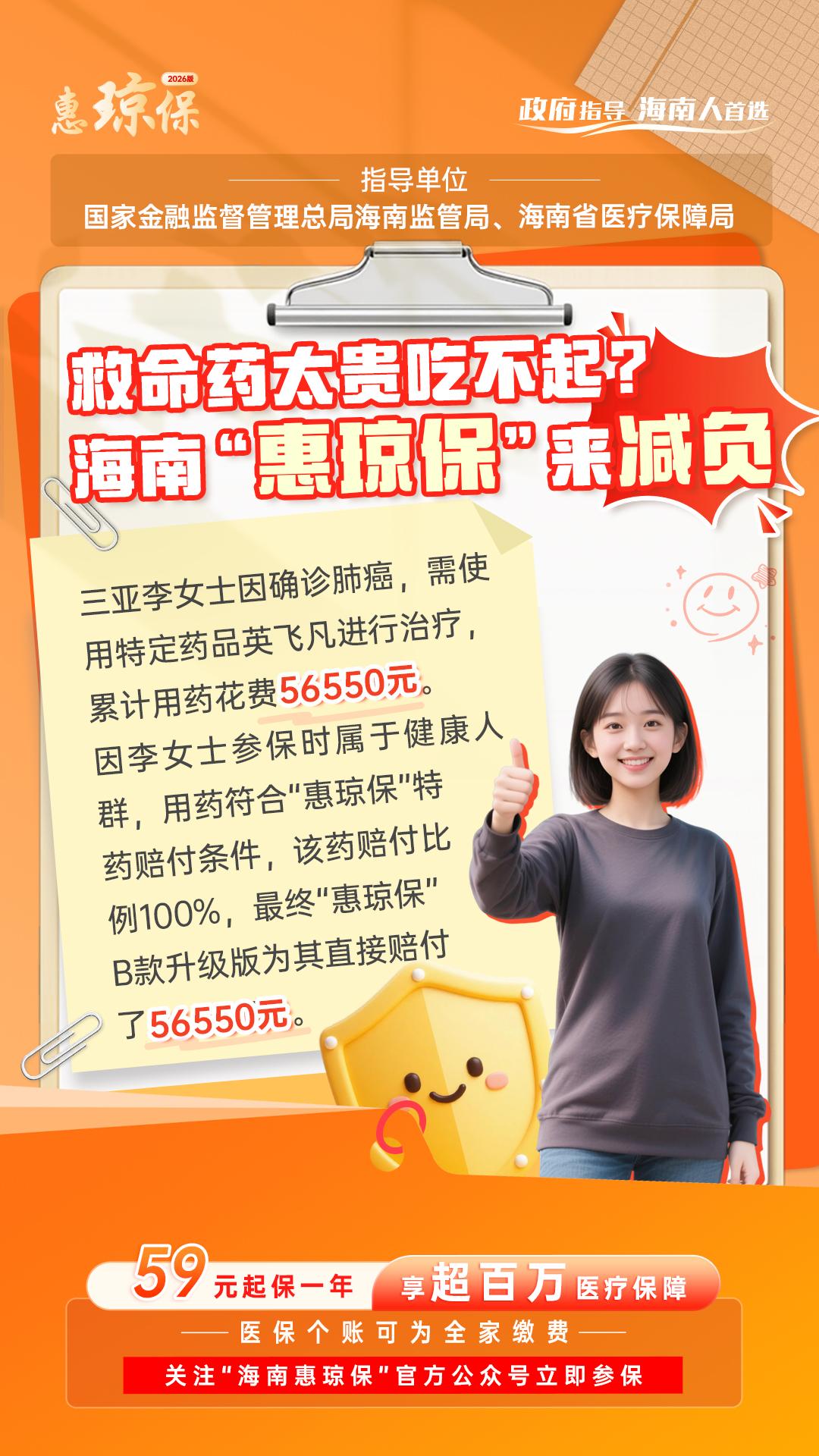 全体海南居民注意!惠琼保 2026 版,给全家稳稳的保障! 概述:还在为高额医疗费用担忧?海南惠琼保 2026 版火热参保中,医保个账就能为全家缴费,福利超多,赶紧来了解! 在海南生活,医疗保障可是大事!现在,海南惠琼保 2026 版给咱送来了实实在在的福利,而且参保正在火热进行中,大家千万别错过! 这惠琼保可是政府指导的项目,由 13 家保险公司组成共保体共同承办 ,品质有保障。它不限年龄、健康状况、职业和户籍,高龄人群、带病人群都能投保,而且可按相应比例获得赔付。真的是包容性满满,照顾到了海南的每一个人。 这次 2026 版惠琼保亮点多多!家庭参保好处特别多,医保范围内的医疗费用责任、医保范围外的自费药品 / 医疗费用责任,免赔额都下降 1000 元。要是上年度参保且未发生理赔的人员连续参保,还能享受更多优待,以 2025 年免赔额为基础,医保内外责任免赔额降低 1000 元,叠加家庭参保最多能降 2000 元,报销门槛大大降低了 。 它的保障也十分全面,有四款保障方案供你选,不管是医保范围内的费用,还是医保范围外的自费药品、医疗费用,甚至特定药品费用都能保。医保报后惠琼保还能报,真真切切减轻大病患者的负担。而且特定药品增加到 115 种,0 免赔额,最高能报销 100 万元呢。 另外,参保后还能享受 24 项健管服务,新增了女性乳腺癌筛查、老年人院内护理等针对特定人群的服务,免费洗牙、体检折扣这些服务也很实用,不出险也能享受。这感觉就像是给全家人请了个健康管家,安心又贴心! 更棒的是,支持使用医保个账余额为符合参保条件的本人及亲属投保,全家投保更轻松,不用额外掏现金。从 2025 年 9 月 16 日到 12 月 31 日都可以参保,保障时间是 2026 年 1 月 1 日至 12 月 31 日,海南全省都能享受这份福利。海南的家人们,赶紧行动起来,为全家的健康加上一层坚实的保障!