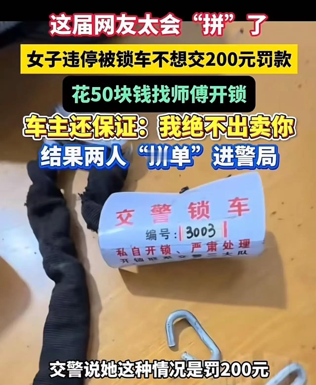 聪明反被聪明误!河南许昌icon,女子违停被交警锁车,不想交 200 元罚款,于是灵机一动,花 50 块钱找来一个开锁师傅开锁。结果两人“拼单”进了警局!网友纷纷调侃:“见过拼饭拼团的,还真没见过‘拼单’进警局的!” 这件事看似一场荒诞的“拼单”闹剧,却折射出当下社会中那些令人哭笑不得的“聪明反被聪明误”的现实。一个小小的违停罚款,竟然演变成一场“智斗”交警、甚至“拼单”进警局的闹剧,背后隐藏的却是我们每个人都曾遇到过的“聪明反被聪明误”的人生教训。 事情的起因很简单:一位女子在许昌的街头违停,被交警发现后,面对200元的罚款,她一时心生“巧计”。她觉得交罚款太麻烦,于是花了50块钱,找来一个开锁师傅,试图用“技术”绕过罚款。这一幕,似乎是“聪明”的体现——花点小钱,省下一笔罚款,何乐而不为?然而,事情的发展远远超出了她的预料。 开锁师傅一开锁,警察随即到场,现场的气氛瞬间变得紧张。女子试图用“拼单”的方式“战胜”交警,却不料这竟成为了“智商税”的一部分——“拼单”进了警局,成为了网友调侃的笑料。这不仅仅是一个荒诞的插曲,更像是一面镜子,映照出部分人在面对规则和法律时的“聪明反被聪明误”。 这件事引发了网络热议:有人说,聪明反被聪明误的背后,是对规则的轻视和对法律的侮辱。有人则感叹:在这个讲究“效率”和“智慧”的时代,许多人似乎忘了,真正的聪明,是懂得尊重规则,知道在规则面前保持理智。而那些试图用“巧妙”手段规避责任的人,最终只会换来更大的麻烦。 更令人深思的是,这个事件也折射出一个社会现象:在某些人的价值观中,似乎“聪明”就是要“躲规避”,而不是“遵守”。这背后,是对法律的漠视,还是对规则的误解?我们是否也曾在生活中,为了“省事”或“图快”,做出一些“聪明”的决定,却不知不觉走向了“误区”? 这起“拼单”进警局的荒诞故事,或许能让我们反思:在这个法治社会里,真正的智慧,应该是懂得在规则中找到合理的平衡,而不是试图用“聪明”去挑战规则的底线。只有这样,我们才能真正实现社会的和谐与正义。 读完这件事,你是否也在心里暗自叹息?我们都希望生活更简单、更智慧,但“聪明”绝不是用来挑战法律的“护身符”。下一次遇到类似的事情,是选择“聪明反被聪明误”,还是冷静遵守规则?也许,答案就在我们每个人的选择中。违停开罚单 违停拍照罚款 车辆违章办理 奇葩违章罚款 开车锁 新乡拍违章