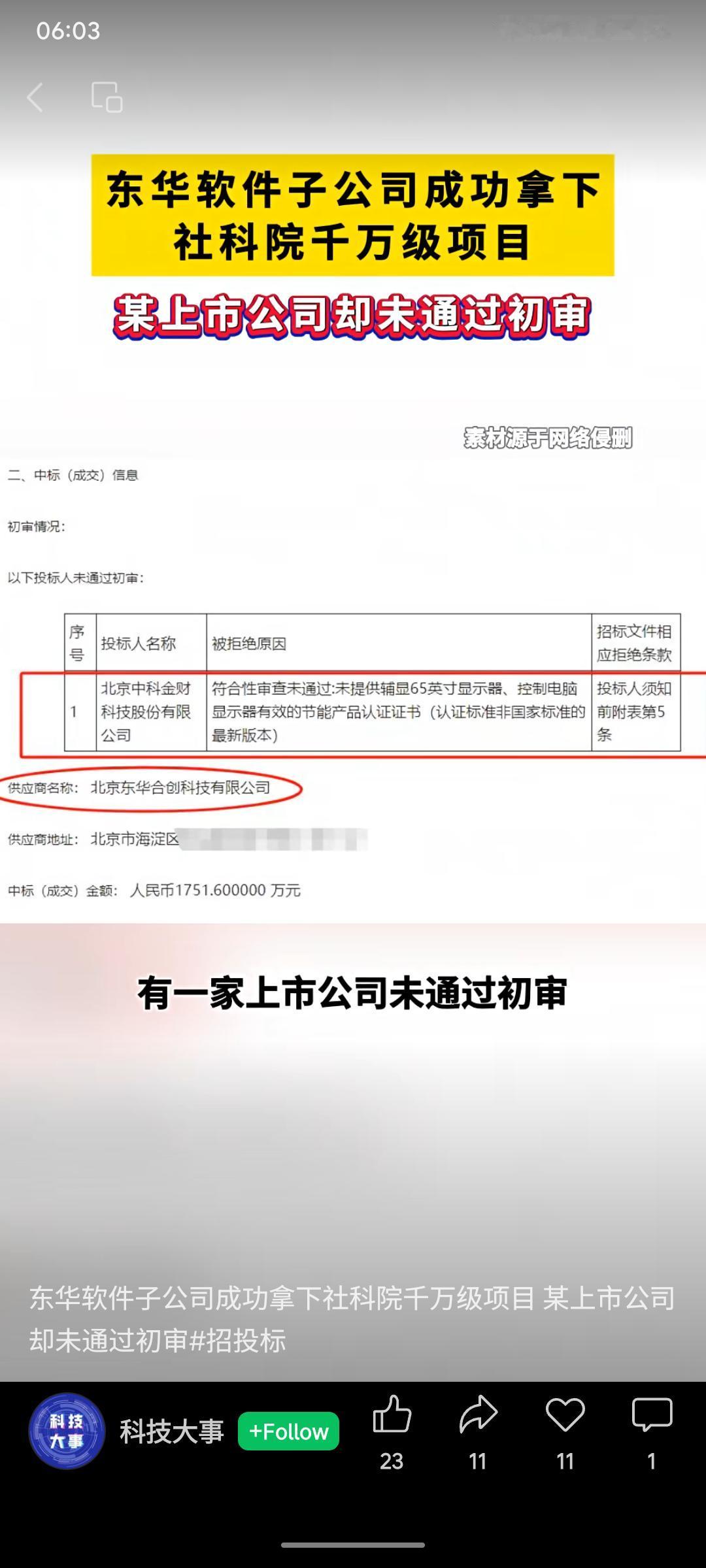 东华软件子公司北京东华合创科技有限公司以1751.6万元中标中国社会科学院成都图书馆会议系统项目。而上市公司北京中科金财科技股份有限公司因产品认证证书不符合最新国家标准,未通过初审。