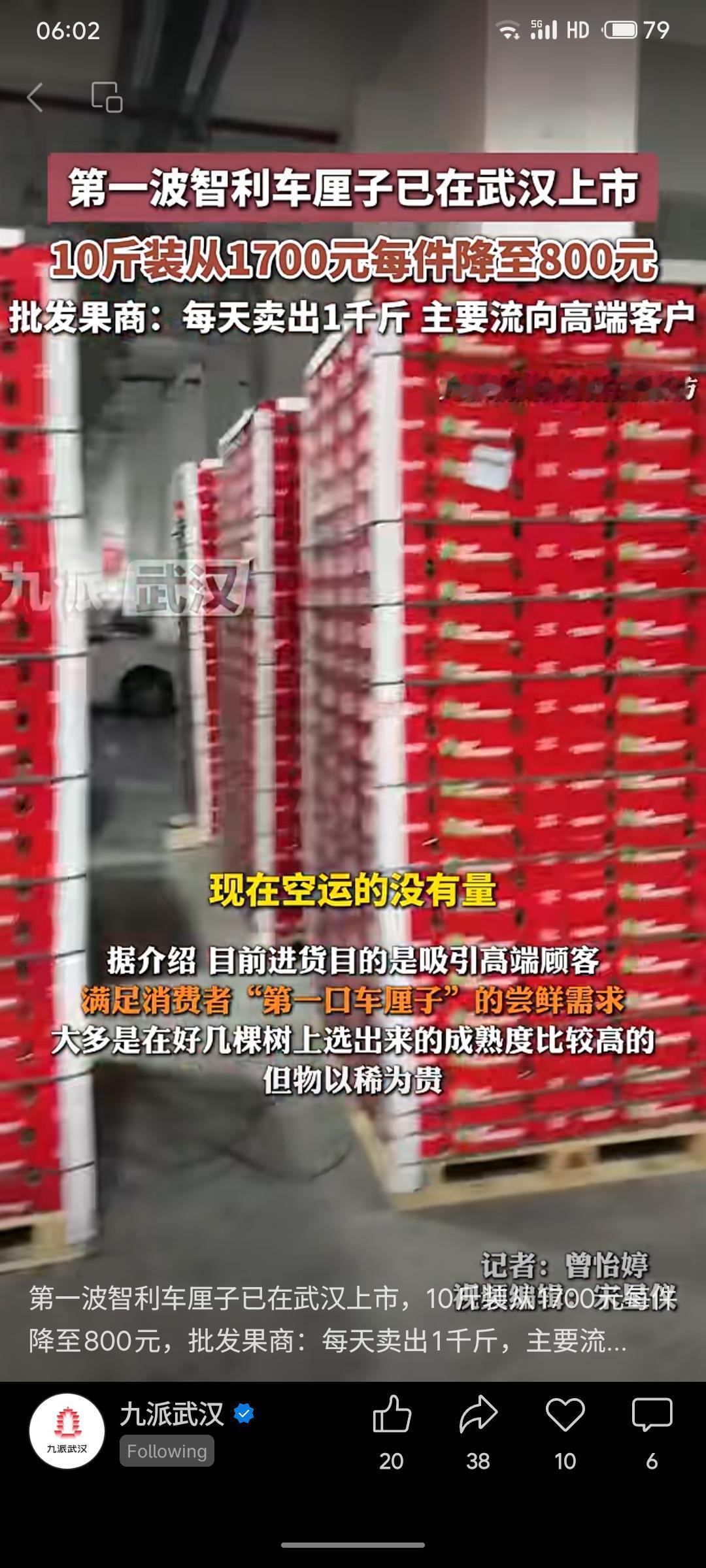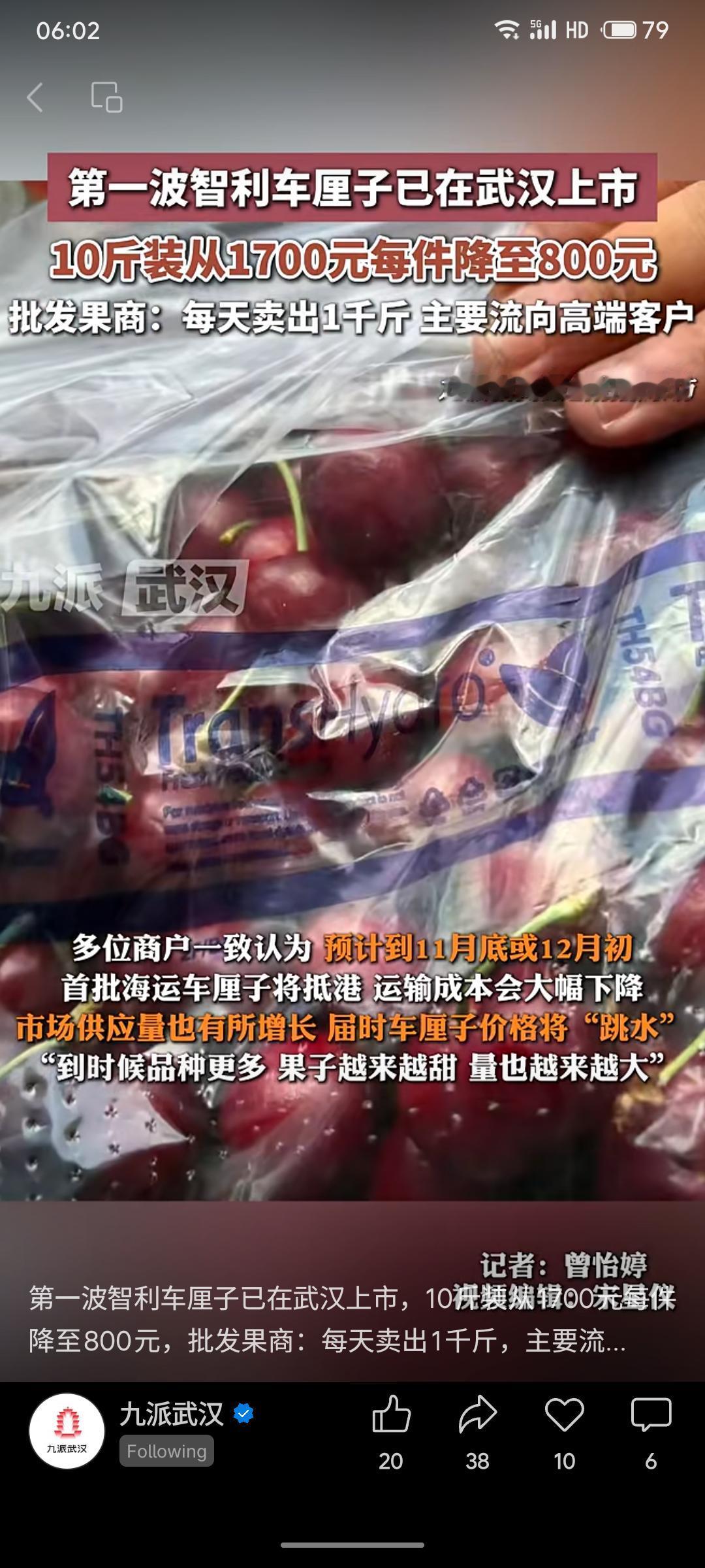 首波智利车厘子已在武汉上市,当前为空运,10斤装价格从1700元降至800元,每日销量约千斤,主要面向高端尝鲜客户。商户预计11月底海运车厘子大量到港后,价格将明显下降。
