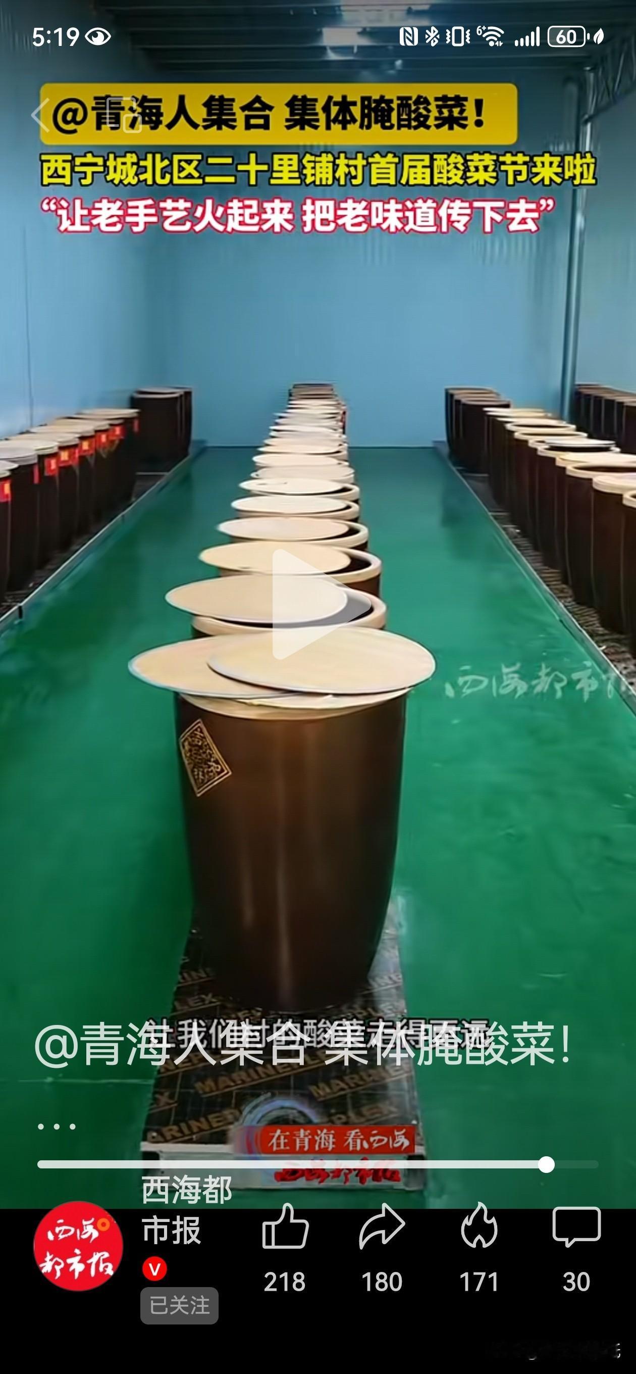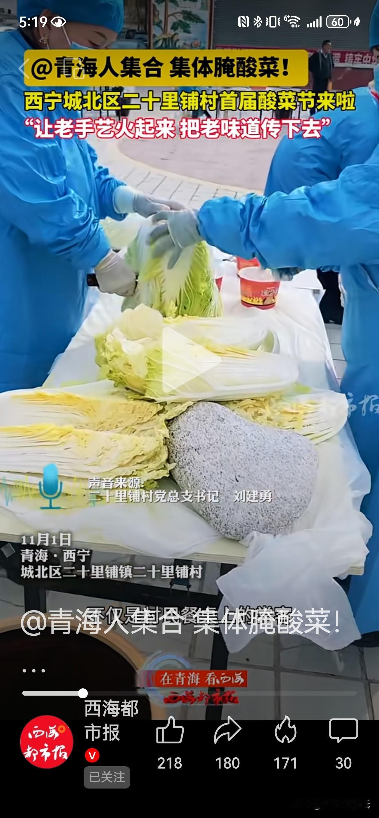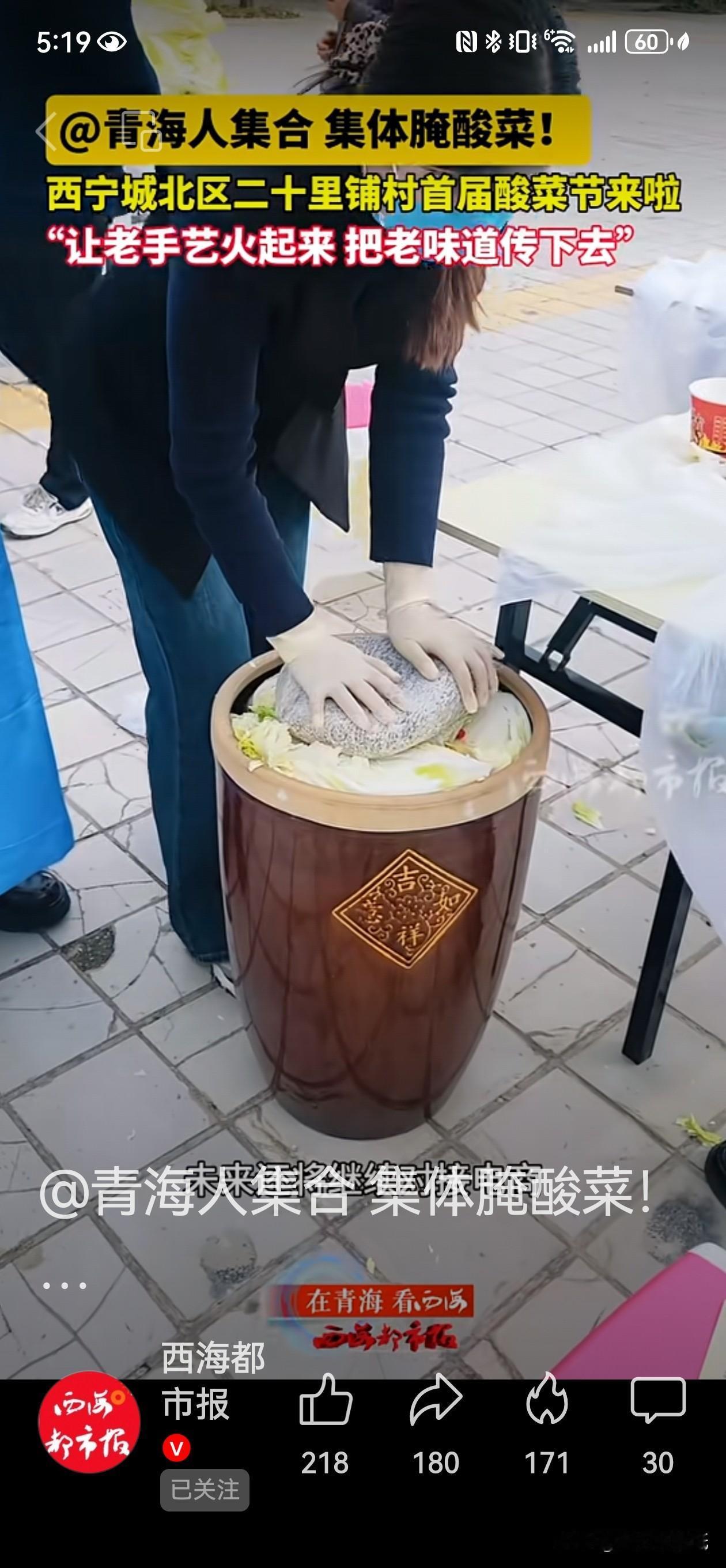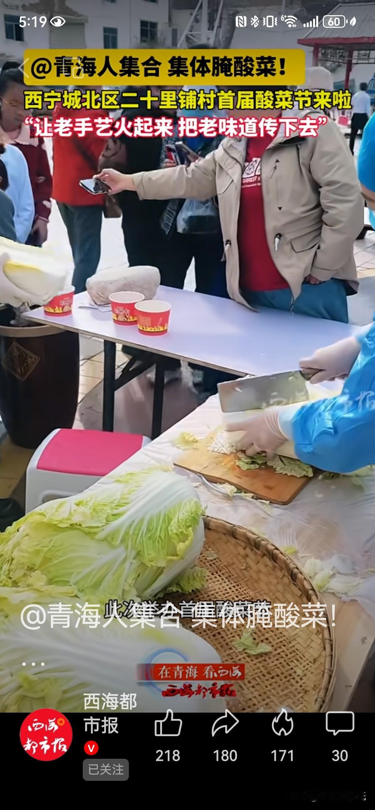 新鲜事!西宁这里举办酸菜节!腌菜老把式现场传艺!快来看看她们是怎么腌菜的! 老姐姐们站在台前,手把手教大伙儿选菜、撒盐、压缸。“白菜得选心实的,盐要按比例放,压缸得用干净大石头。”围观的村民个个伸着脖子看,有的赶紧记步骤,有的撸起袖子就上手试。 七零后、八零后的青海人,谁不是吃着酸菜长大的?过去冬天哪有新鲜绿菜,全靠这一缸酸菜过冬。如今生活好了,家家户户腌菜的少了,可那份酸溜溜的老味道,始终是青海人心里最深的念想。 酸菜,在青海人眼里,那可是冬天离不开的“当家菜”。尤其在河湟地区,过去一入冬,家家户户都得腌上几大缸。那时候天冷缺鲜菜,就靠这一口酸香撑过漫漫长冬。 如今,城里通了暖气,家里腌菜的也少了。但在农村,这老传统还留着——只是年轻人大多不会做了。这次酸菜节,从尝到学,手把手地教,真是把老根儿扶正了。 把这手艺传下去,既能让城里人尝到记忆里的“妈妈味道”,又能帮乡亲们增收,确实是件好事。当然,腌菜也得讲干净卫生,之前外地“老痰酸菜”的教训咱可不能不放在心上。 秋日生活打卡季