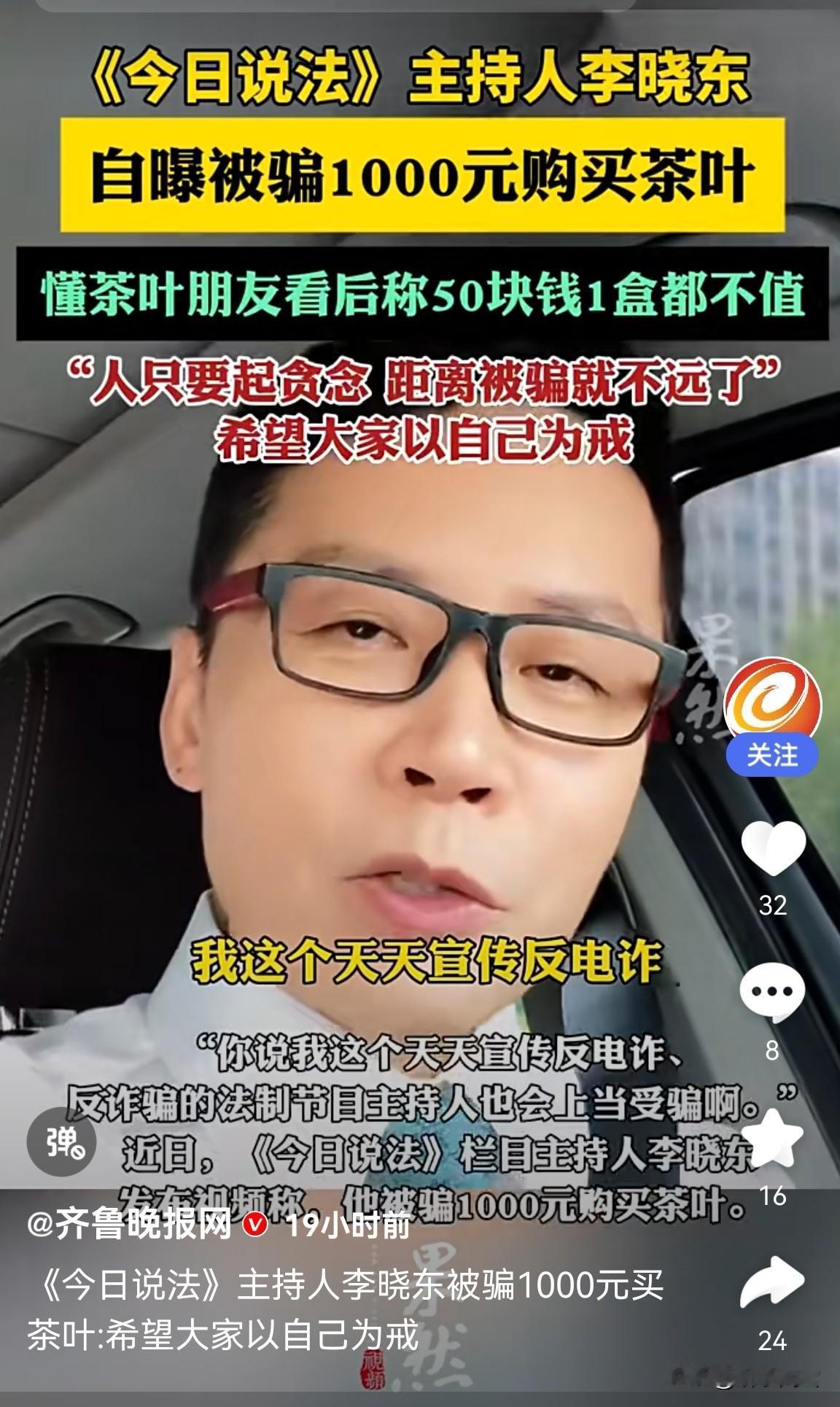 这不是笑话!连《今日说法》的主持人李晓东都被骗了。他在银行门口买了便宜茶叶,5盒花了1000块。你说气不气人? 银行里被骗歹是理财,银行门外被骗是卖茶叶。这事儿一点都不新鲜!因为那儿人多,更关键的是信任感拉满!老百姓觉得,银行边上能有啥坏事儿?老头老太太揣着养老钱来存钱,一瞅旁边有人“清仓甩卖”,价格还低得人心动,脑子一热,钱掏出来了。骗子就吃准这点,专挑这种安全地带下套。 甭管你是谁,主持人咋的,专家也是人,一听到省钱,便宜,就半推半就。话说谁不占便宜,可天上真不掉馅饼,掉下来的多半是陷阱。 说到底,诈骗为啥屡禁不绝?因为根子在“信息不对称”和“人心弱点”。光靠提醒没用,得让骗子没地儿站、没话讲、没人信。监管得进社区、进银行门口,宣传别整虚的,就得讲这种“5盒茶叶骗1000块”的真事儿。人人警醒,骗子才没市场。 视频转图文大赛 真实今日说法
